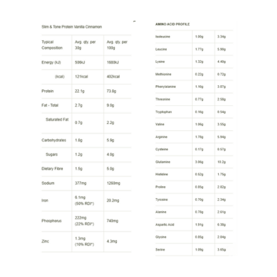 {"id":10005570814248,"title":"Amazonia Raw Protein Slim \u0026 Tone Vanilla Cinnamon 500g","handle":"amazonia-raw-protein-slim-tone-vanilla-cinnamon-500g","description":"\u003cp\u003e\u003cspan\u003eDesigned to support a healthy metabolism, minimise cravings, tone muscle and support weight management.\u003c\/span\u003e\u003c\/p\u003e\n\u003ch5\u003eReviews\u003c\/h5\u003e\n\u003cp\u003eReviews go here\u003c\/p\u003e\n\u003ch5\u003eIngredients\u003c\/h5\u003e\n\u003cp\u003eAny images, tags, filters, product categories, and any other information on this website showing ingredients, nutrition panels, or allergy statements are for guidance only, as manufacturers often change their formulations without notice. Please contact the manufacturer for the most up-to-date ingredient information, or email us to confirm the ingredients of the stock currently on hand.\u003c\/p\u003e","published_at":"2025-11-21T10:12:53+11:00","created_at":"2025-11-21T10:12:53+11:00","vendor":"Amazonia","type":"","tags":["Protein Powders","Sydney Store"],"price":4390,"price_min":4390,"price_max":4390,"available":true,"price_varies":false,"compare_at_price":null,"compare_at_price_min":0,"compare_at_price_max":0,"compare_at_price_varies":false,"variants":[{"id":51075556639016,"title":"Default Title","option1":"Default Title","option2":null,"option3":null,"sku":"9344060000626","requires_shipping":true,"taxable":true,"featured_image":null,"available":true,"name":"Amazonia Raw Protein Slim \u0026 Tone Vanilla Cinnamon 500g","public_title":null,"options":["Default Title"],"price":4390,"weight":0,"compare_at_price":null,"inventory_quantity":3,"inventory_management":"shopify","inventory_policy":"deny","barcode":null,"requires_selling_plan":false,"selling_plan_allocations":[]}],"images":["\/\/crueltyfreeshop.com.au\/cdn\/shop\/files\/ProteinSlim_ToneVanillaCinnamon500g.png?v=1763789743","\/\/crueltyfreeshop.com.au\/cdn\/shop\/files\/RAWslimtone-NutritionalInfo.png?v=1764196493","\/\/crueltyfreeshop.com.au\/cdn\/shop\/files\/RAWslimtone-Ingredients.png?v=1764196493"],"featured_image":"\/\/crueltyfreeshop.com.au\/cdn\/shop\/files\/ProteinSlim_ToneVanillaCinnamon500g.png?v=1763789743","options":["Title"],"media":[{"alt":null,"id":43028679393576,"position":1,"preview_image":{"aspect_ratio":1.0,"height":400,"width":400,"src":"\/\/crueltyfreeshop.com.au\/cdn\/shop\/files\/ProteinSlim_ToneVanillaCinnamon500g.png?v=1763789743"},"aspect_ratio":1.0,"height":400,"media_type":"image","src":"\/\/crueltyfreeshop.com.au\/cdn\/shop\/files\/ProteinSlim_ToneVanillaCinnamon500g.png?v=1763789743","width":400},{"alt":null,"id":43090700042536,"position":2,"preview_image":{"aspect_ratio":1.0,"height":400,"width":400,"src":"\/\/crueltyfreeshop.com.au\/cdn\/shop\/files\/RAWslimtone-NutritionalInfo.png?v=1764196493"},"aspect_ratio":1.0,"height":400,"media_type":"image","src":"\/\/crueltyfreeshop.com.au\/cdn\/shop\/files\/RAWslimtone-NutritionalInfo.png?v=1764196493","width":400},{"alt":null,"id":43090700075304,"position":3,"preview_image":{"aspect_ratio":1.0,"height":400,"width":400,"src":"\/\/crueltyfreeshop.com.au\/cdn\/shop\/files\/RAWslimtone-Ingredients.png?v=1764196493"},"aspect_ratio":1.0,"height":400,"media_type":"image","src":"\/\/crueltyfreeshop.com.au\/cdn\/shop\/files\/RAWslimtone-Ingredients.png?v=1764196493","width":400}],"requires_selling_plan":false,"selling_plan_groups":[],"content":"\u003cp\u003e\u003cspan\u003eDesigned to support a healthy metabolism, minimise cravings, tone muscle and support weight management.\u003c\/span\u003e\u003c\/p\u003e\n\u003ch5\u003eReviews\u003c\/h5\u003e\n\u003cp\u003eReviews go here\u003c\/p\u003e\n\u003ch5\u003eIngredients\u003c\/h5\u003e\n\u003cp\u003eAny images, tags, filters, product categories, and any other information on this website showing ingredients, nutrition panels, or allergy statements are for guidance only, as manufacturers often change their formulations without notice. Please contact the manufacturer for the most up-to-date ingredient information, or email us to confirm the ingredients of the stock currently on hand.\u003c\/p\u003e"}