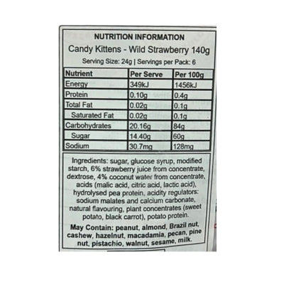 {"id":9894605685032,"title":"Candy Kittens Sweets - Wild Strawberry 140g","handle":"candy-kittens-sweets-wild-strawberry-140g","description":"\u003cp\u003e\u003c!--StartFragment--\u003e\u003c\/p\u003e\n\u003cp\u003e\u003c!--StartFragment--\u003e \u003c!--EndFragment--\u003e\u003c\/p\u003e\n\u003cp\u003e\u003c!--StartFragment--\u003eDescription\u003c!--EndFragment--\u003e\u003c\/p\u003e\n\u003cp\u003e140g. Ingredients: \u003c\/p\u003e\n\u003cp\u003eAllergen information: \u003c\/p\u003e\n\u003cp\u003e \u003c\/p\u003e","published_at":"2025-11-12T10:33:40+11:00","created_at":"2025-11-12T10:33:39+11:00","vendor":"Candy Kittens","type":"Food","tags":["Sweets","Sydney Store"],"price":925,"price_min":925,"price_max":925,"available":false,"price_varies":false,"compare_at_price":null,"compare_at_price_min":0,"compare_at_price_max":0,"compare_at_price_varies":false,"variants":[{"id":50929832788264,"title":"Default Title","option1":"Default Title","option2":null,"option3":null,"sku":"5060384262918","requires_shipping":true,"taxable":true,"featured_image":null,"available":false,"name":"Candy Kittens Sweets - Wild Strawberry 140g","public_title":null,"options":["Default Title"],"price":925,"weight":0,"compare_at_price":null,"inventory_quantity":0,"inventory_management":"shopify","inventory_policy":"deny","barcode":null,"requires_selling_plan":false,"selling_plan_allocations":[]}],"images":["\/\/crueltyfreeshop.com.au\/cdn\/shop\/files\/CandyKittensWildStrawberry_6be4f336-1e97-4646-8fb7-a60fe7419d36.jpg?v=1763506167","\/\/crueltyfreeshop.com.au\/cdn\/shop\/files\/candykittenstrawberry-NutritionalInfo.jpg?v=1763956939"],"featured_image":"\/\/crueltyfreeshop.com.au\/cdn\/shop\/files\/CandyKittensWildStrawberry_6be4f336-1e97-4646-8fb7-a60fe7419d36.jpg?v=1763506167","options":["Title"],"media":[{"alt":null,"id":43006345543976,"position":1,"preview_image":{"aspect_ratio":1.0,"height":1600,"width":1600,"src":"\/\/crueltyfreeshop.com.au\/cdn\/shop\/files\/CandyKittensWildStrawberry_6be4f336-1e97-4646-8fb7-a60fe7419d36.jpg?v=1763506167"},"aspect_ratio":1.0,"height":1600,"media_type":"image","src":"\/\/crueltyfreeshop.com.au\/cdn\/shop\/files\/CandyKittensWildStrawberry_6be4f336-1e97-4646-8fb7-a60fe7419d36.jpg?v=1763506167","width":1600},{"alt":null,"id":43044257726760,"position":2,"preview_image":{"aspect_ratio":1.0,"height":400,"width":400,"src":"\/\/crueltyfreeshop.com.au\/cdn\/shop\/files\/candykittenstrawberry-NutritionalInfo.jpg?v=1763956939"},"aspect_ratio":1.0,"height":400,"media_type":"image","src":"\/\/crueltyfreeshop.com.au\/cdn\/shop\/files\/candykittenstrawberry-NutritionalInfo.jpg?v=1763956939","width":400}],"requires_selling_plan":false,"selling_plan_groups":[],"content":"\u003cp\u003e\u003c!--StartFragment--\u003e\u003c\/p\u003e\n\u003cp\u003e\u003c!--StartFragment--\u003e \u003c!--EndFragment--\u003e\u003c\/p\u003e\n\u003cp\u003e\u003c!--StartFragment--\u003eDescription\u003c!--EndFragment--\u003e\u003c\/p\u003e\n\u003cp\u003e140g. Ingredients: \u003c\/p\u003e\n\u003cp\u003eAllergen information: \u003c\/p\u003e\n\u003cp\u003e \u003c\/p\u003e"}