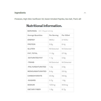 {"id":9848474435880,"title":"Proper Crisps Big Cut Smoked Paprika 140g","handle":"proper-crisps-big-cut-smoked-paprika-140g","description":"\u003cp\u003e \u003c\/p\u003e\n\u003ch5\u003eReviews\u003c\/h5\u003e\n\u003cp\u003eReviews go here\u003c\/p\u003e\n\u003ch5\u003eIngredients\u003c\/h5\u003e\n\u003cp\u003eAny images, tags, filters, product categories, and any other information on this website showing ingredients, nutrition panels, or allergy statements are for guidance only, as manufacturers often change their formulations without notice. Please contact the manufacturer for the most up-to-date ingredient information, or email us to confirm the ingredients of the stock currently on hand.\u003c\/p\u003e","published_at":"2025-10-13T13:27:01+11:00","created_at":"2025-10-13T13:27:00+11:00","vendor":"Proper Crisps","type":"","tags":["Crisps","Sydney Store"],"price":699,"price_min":699,"price_max":699,"available":true,"price_varies":false,"compare_at_price":null,"compare_at_price_min":0,"compare_at_price_max":0,"compare_at_price_varies":false,"variants":[{"id":50826274668840,"title":"Default Title","option1":"Default Title","option2":null,"option3":null,"sku":"9421905498678","requires_shipping":true,"taxable":true,"featured_image":null,"available":true,"name":"Proper Crisps Big Cut Smoked Paprika 140g","public_title":null,"options":["Default Title"],"price":699,"weight":140,"compare_at_price":null,"inventory_quantity":14,"inventory_management":"shopify","inventory_policy":"deny","barcode":null,"requires_selling_plan":false,"selling_plan_allocations":[]}],"images":["\/\/crueltyfreeshop.com.au\/cdn\/shop\/files\/PCP150.png?v=1764727698","\/\/crueltyfreeshop.com.au\/cdn\/shop\/files\/ProperBigCutPaprika-NutritionalInfo.jpg?v=1768344462"],"featured_image":"\/\/crueltyfreeshop.com.au\/cdn\/shop\/files\/PCP150.png?v=1764727698","options":["Title"],"media":[{"alt":null,"id":43121715740968,"position":1,"preview_image":{"aspect_ratio":1.0,"height":800,"width":800,"src":"\/\/crueltyfreeshop.com.au\/cdn\/shop\/files\/PCP150.png?v=1764727698"},"aspect_ratio":1.0,"height":800,"media_type":"image","src":"\/\/crueltyfreeshop.com.au\/cdn\/shop\/files\/PCP150.png?v=1764727698","width":800},{"alt":null,"id":43302485000488,"position":2,"preview_image":{"aspect_ratio":1.0,"height":400,"width":400,"src":"\/\/crueltyfreeshop.com.au\/cdn\/shop\/files\/ProperBigCutPaprika-NutritionalInfo.jpg?v=1768344462"},"aspect_ratio":1.0,"height":400,"media_type":"image","src":"\/\/crueltyfreeshop.com.au\/cdn\/shop\/files\/ProperBigCutPaprika-NutritionalInfo.jpg?v=1768344462","width":400}],"requires_selling_plan":false,"selling_plan_groups":[],"content":"\u003cp\u003e \u003c\/p\u003e\n\u003ch5\u003eReviews\u003c\/h5\u003e\n\u003cp\u003eReviews go here\u003c\/p\u003e\n\u003ch5\u003eIngredients\u003c\/h5\u003e\n\u003cp\u003eAny images, tags, filters, product categories, and any other information on this website showing ingredients, nutrition panels, or allergy statements are for guidance only, as manufacturers often change their formulations without notice. Please contact the manufacturer for the most up-to-date ingredient information, or email us to confirm the ingredients of the stock currently on hand.\u003c\/p\u003e"}