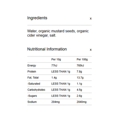 {"id":9486875722024,"title":"Spiral Foods Mustard - Dijon Organic 200g","handle":"spiral-foods-mustard-dijon-organic-200g","description":"\u003cp\u003e \u003c\/p\u003e\n\u003ch5\u003eReviews\u003c\/h5\u003e\n\u003cp\u003eReviews go here\u003c\/p\u003e\n\u003ch5\u003eIngredients\u003c\/h5\u003e\n\u003cp\u003eAny images, tags, filters, product categories, and any other information on this website showing ingredients, nutrition panels, or allergy statements are for guidance only, as manufacturers often change their formulations without notice. Please contact the manufacturer for the most up-to-date ingredient information, or email us to confirm the ingredients of the stock currently on hand.\u003c\/p\u003e","published_at":"2025-11-19T11:22:04+11:00","created_at":"2024-11-07T16:18:47+11:00","vendor":"Spiral Foods","type":"General","tags":["Cooking Pastes","Savoury Sauces","Sydney Store"],"price":648,"price_min":648,"price_max":648,"available":true,"price_varies":false,"compare_at_price":null,"compare_at_price_min":0,"compare_at_price_max":0,"compare_at_price_varies":false,"variants":[{"id":49487043854632,"title":"Default Title","option1":"Default Title","option2":null,"option3":null,"sku":"9312336763001","requires_shipping":true,"taxable":false,"featured_image":null,"available":true,"name":"Spiral Foods Mustard - Dijon Organic 200g","public_title":null,"options":["Default Title"],"price":648,"weight":0,"compare_at_price":null,"inventory_quantity":4,"inventory_management":"shopify","inventory_policy":"deny","barcode":null,"requires_selling_plan":false,"selling_plan_allocations":[]}],"images":["\/\/crueltyfreeshop.com.au\/cdn\/shop\/files\/Spiral_Medit_MustardDijon_1.jpg?v=1730956727","\/\/crueltyfreeshop.com.au\/cdn\/shop\/files\/SpiralDijon-NutritionalInformation.png?v=1764551149"],"featured_image":"\/\/crueltyfreeshop.com.au\/cdn\/shop\/files\/Spiral_Medit_MustardDijon_1.jpg?v=1730956727","options":["Title"],"media":[{"alt":null,"id":40433869160744,"position":1,"preview_image":{"aspect_ratio":1.0,"height":2000,"width":2000,"src":"\/\/crueltyfreeshop.com.au\/cdn\/shop\/files\/Spiral_Medit_MustardDijon_1.jpg?v=1730956727"},"aspect_ratio":1.0,"height":2000,"media_type":"image","src":"\/\/crueltyfreeshop.com.au\/cdn\/shop\/files\/Spiral_Medit_MustardDijon_1.jpg?v=1730956727","width":2000},{"alt":null,"id":43111955693864,"position":2,"preview_image":{"aspect_ratio":1.0,"height":400,"width":400,"src":"\/\/crueltyfreeshop.com.au\/cdn\/shop\/files\/SpiralDijon-NutritionalInformation.png?v=1764551149"},"aspect_ratio":1.0,"height":400,"media_type":"image","src":"\/\/crueltyfreeshop.com.au\/cdn\/shop\/files\/SpiralDijon-NutritionalInformation.png?v=1764551149","width":400}],"requires_selling_plan":false,"selling_plan_groups":[],"content":"\u003cp\u003e \u003c\/p\u003e\n\u003ch5\u003eReviews\u003c\/h5\u003e\n\u003cp\u003eReviews go here\u003c\/p\u003e\n\u003ch5\u003eIngredients\u003c\/h5\u003e\n\u003cp\u003eAny images, tags, filters, product categories, and any other information on this website showing ingredients, nutrition panels, or allergy statements are for guidance only, as manufacturers often change their formulations without notice. Please contact the manufacturer for the most up-to-date ingredient information, or email us to confirm the ingredients of the stock currently on hand.\u003c\/p\u003e"}