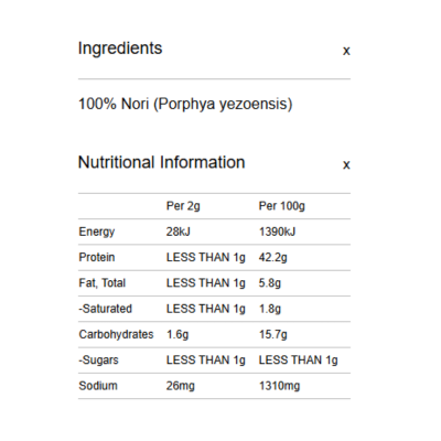 {"id":9486880571688,"title":"Spiral Foods - Nori Krinkles 10g","handle":"spiral-foods-nori-krinkles-10g","description":"\u003cp\u003e \u003c\/p\u003e\n\u003ch5\u003eReviews\u003c\/h5\u003e\n\u003cp\u003eReviews go here\u003c\/p\u003e\n\u003ch5\u003eIngredients\u003c\/h5\u003e\n\u003cp\u003eAny images, tags, filters, product categories, and any other information on this website showing ingredients, nutrition panels, or allergy statements are for guidance only, as manufacturers often change their formulations without notice. Please contact the manufacturer for the most up-to-date ingredient information, or email us to confirm the ingredients of the stock currently on hand.\u003c\/p\u003e","published_at":"2025-03-05T12:37:11+11:00","created_at":"2024-11-07T17:03:43+11:00","vendor":"Spiral Foods","type":"General","tags":["Seaweed","Sydney Store"],"price":635,"price_min":635,"price_max":635,"available":true,"price_varies":false,"compare_at_price":null,"compare_at_price_min":0,"compare_at_price_max":0,"compare_at_price_varies":false,"variants":[{"id":49487108833576,"title":"Default Title","option1":"Default Title","option2":null,"option3":null,"sku":"4958325003434","requires_shipping":true,"taxable":false,"featured_image":null,"available":true,"name":"Spiral Foods - Nori Krinkles 10g","public_title":null,"options":["Default Title"],"price":635,"weight":0,"compare_at_price":null,"inventory_quantity":5,"inventory_management":"shopify","inventory_policy":"deny","barcode":null,"requires_selling_plan":false,"selling_plan_allocations":[]}],"images":["\/\/crueltyfreeshop.com.au\/cdn\/shop\/files\/Spiral_SeaVeg_NoriKrinkles_1.jpg?v=1730959423","\/\/crueltyfreeshop.com.au\/cdn\/shop\/files\/SpiralCrispyNori-NutritionalInformation.png?v=1764550992"],"featured_image":"\/\/crueltyfreeshop.com.au\/cdn\/shop\/files\/Spiral_SeaVeg_NoriKrinkles_1.jpg?v=1730959423","options":["Title"],"media":[{"alt":null,"id":40433992925480,"position":1,"preview_image":{"aspect_ratio":1.0,"height":2000,"width":2000,"src":"\/\/crueltyfreeshop.com.au\/cdn\/shop\/files\/Spiral_SeaVeg_NoriKrinkles_1.jpg?v=1730959423"},"aspect_ratio":1.0,"height":2000,"media_type":"image","src":"\/\/crueltyfreeshop.com.au\/cdn\/shop\/files\/Spiral_SeaVeg_NoriKrinkles_1.jpg?v=1730959423","width":2000},{"alt":null,"id":43111949861160,"position":2,"preview_image":{"aspect_ratio":1.0,"height":400,"width":400,"src":"\/\/crueltyfreeshop.com.au\/cdn\/shop\/files\/SpiralCrispyNori-NutritionalInformation.png?v=1764550992"},"aspect_ratio":1.0,"height":400,"media_type":"image","src":"\/\/crueltyfreeshop.com.au\/cdn\/shop\/files\/SpiralCrispyNori-NutritionalInformation.png?v=1764550992","width":400}],"requires_selling_plan":false,"selling_plan_groups":[],"content":"\u003cp\u003e \u003c\/p\u003e\n\u003ch5\u003eReviews\u003c\/h5\u003e\n\u003cp\u003eReviews go here\u003c\/p\u003e\n\u003ch5\u003eIngredients\u003c\/h5\u003e\n\u003cp\u003eAny images, tags, filters, product categories, and any other information on this website showing ingredients, nutrition panels, or allergy statements are for guidance only, as manufacturers often change their formulations without notice. Please contact the manufacturer for the most up-to-date ingredient information, or email us to confirm the ingredients of the stock currently on hand.\u003c\/p\u003e"}