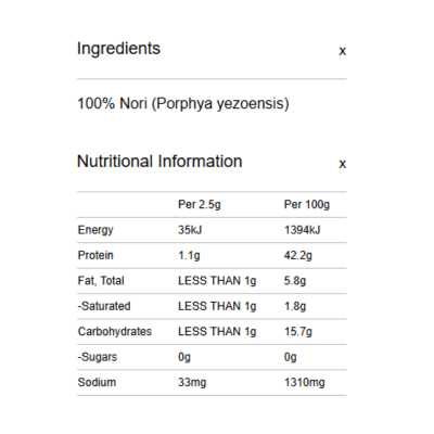 {"id":9486880440616,"title":"Spiral Foods - Nori Yaki Sushi Nori 25g","handle":"spiral-foods-nori-yaki-sushi-nori-25g","description":"\u003cp\u003e \u003c\/p\u003e\n\u003ch5\u003eReviews\u003c\/h5\u003e\n\u003cp\u003eReviews go here\u003c\/p\u003e\n\u003ch5\u003eIngredients\u003c\/h5\u003e\n\u003cp\u003eAny images, tags, filters, product categories, and any other information on this website showing ingredients, nutrition panels, or allergy statements are for guidance only, as manufacturers often change their formulations without notice. Please contact the manufacturer for the most up-to-date ingredient information, or email us to confirm the ingredients of the stock currently on hand.\u003c\/p\u003e","published_at":"2025-09-15T16:36:04+10:00","created_at":"2024-11-07T17:03:18+11:00","vendor":"Spiral Foods","type":"General","tags":["Seaweed","Sydney Store"],"price":896,"price_min":896,"price_max":896,"available":true,"price_varies":false,"compare_at_price":null,"compare_at_price_min":0,"compare_at_price_max":0,"compare_at_price_varies":false,"variants":[{"id":49487108276520,"title":"Default Title","option1":"Default Title","option2":null,"option3":null,"sku":"9312336015766","requires_shipping":true,"taxable":false,"featured_image":null,"available":true,"name":"Spiral Foods - Nori Yaki Sushi Nori 25g","public_title":null,"options":["Default Title"],"price":896,"weight":0,"compare_at_price":null,"inventory_quantity":2,"inventory_management":"shopify","inventory_policy":"deny","barcode":null,"requires_selling_plan":false,"selling_plan_allocations":[]}],"images":["\/\/crueltyfreeshop.com.au\/cdn\/shop\/files\/Spiral_SeaVeg_NoriSheets_1.jpg?v=1730959398","\/\/crueltyfreeshop.com.au\/cdn\/shop\/files\/SpiralSushiNori-NutritionalInformation.png?v=1764552710"],"featured_image":"\/\/crueltyfreeshop.com.au\/cdn\/shop\/files\/Spiral_SeaVeg_NoriSheets_1.jpg?v=1730959398","options":["Title"],"media":[{"alt":null,"id":40433991811368,"position":1,"preview_image":{"aspect_ratio":1.0,"height":2000,"width":2000,"src":"\/\/crueltyfreeshop.com.au\/cdn\/shop\/files\/Spiral_SeaVeg_NoriSheets_1.jpg?v=1730959398"},"aspect_ratio":1.0,"height":2000,"media_type":"image","src":"\/\/crueltyfreeshop.com.au\/cdn\/shop\/files\/Spiral_SeaVeg_NoriSheets_1.jpg?v=1730959398","width":2000},{"alt":null,"id":43112057307432,"position":2,"preview_image":{"aspect_ratio":1.0,"height":400,"width":400,"src":"\/\/crueltyfreeshop.com.au\/cdn\/shop\/files\/SpiralSushiNori-NutritionalInformation.png?v=1764552710"},"aspect_ratio":1.0,"height":400,"media_type":"image","src":"\/\/crueltyfreeshop.com.au\/cdn\/shop\/files\/SpiralSushiNori-NutritionalInformation.png?v=1764552710","width":400}],"requires_selling_plan":false,"selling_plan_groups":[],"content":"\u003cp\u003e \u003c\/p\u003e\n\u003ch5\u003eReviews\u003c\/h5\u003e\n\u003cp\u003eReviews go here\u003c\/p\u003e\n\u003ch5\u003eIngredients\u003c\/h5\u003e\n\u003cp\u003eAny images, tags, filters, product categories, and any other information on this website showing ingredients, nutrition panels, or allergy statements are for guidance only, as manufacturers often change their formulations without notice. Please contact the manufacturer for the most up-to-date ingredient information, or email us to confirm the ingredients of the stock currently on hand.\u003c\/p\u003e"}
