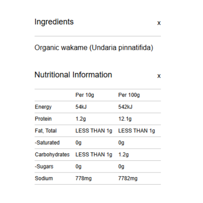 {"id":9486880211240,"title":"Spiral Foods - Organic Wakame 50g","handle":"spiral-foods-organic-wakame-50g","description":"\u003cp\u003e \u003c\/p\u003e\n\u003ch5\u003eReviews\u003c\/h5\u003e\n\u003cp\u003eReviews go here\u003c\/p\u003e\n\u003ch5\u003eIngredients\u003c\/h5\u003e\n\u003cp\u003eAny images, tags, filters, product categories, and any other information on this website showing ingredients, nutrition panels, or allergy statements are for guidance only, as manufacturers often change their formulations without notice. Please contact the manufacturer for the most up-to-date ingredient information, or email us to confirm the ingredients of the stock currently on hand.\u003c\/p\u003e","published_at":"2025-11-19T11:21:22+11:00","created_at":"2024-11-07T17:01:42+11:00","vendor":"Spiral Foods","type":"General","tags":["Seaweed","Sydney Store"],"price":1852,"price_min":1852,"price_max":1852,"available":true,"price_varies":false,"compare_at_price":null,"compare_at_price_min":0,"compare_at_price_max":0,"compare_at_price_varies":false,"variants":[{"id":49487107490088,"title":"Default Title","option1":"Default Title","option2":null,"option3":null,"sku":"9312336015162","requires_shipping":true,"taxable":false,"featured_image":null,"available":true,"name":"Spiral Foods - Organic Wakame 50g","public_title":null,"options":["Default Title"],"price":1852,"weight":0,"compare_at_price":null,"inventory_quantity":3,"inventory_management":"shopify","inventory_policy":"deny","barcode":null,"requires_selling_plan":false,"selling_plan_allocations":[]}],"images":["\/\/crueltyfreeshop.com.au\/cdn\/shop\/files\/Spiral_SeaVeg_Wakame_1.jpg?v=1730959302","\/\/crueltyfreeshop.com.au\/cdn\/shop\/files\/SpiralWakame-NutritionalInformation.png?v=1764551297"],"featured_image":"\/\/crueltyfreeshop.com.au\/cdn\/shop\/files\/Spiral_SeaVeg_Wakame_1.jpg?v=1730959302","options":["Title"],"media":[{"alt":null,"id":40433988763944,"position":1,"preview_image":{"aspect_ratio":1.0,"height":2000,"width":2000,"src":"\/\/crueltyfreeshop.com.au\/cdn\/shop\/files\/Spiral_SeaVeg_Wakame_1.jpg?v=1730959302"},"aspect_ratio":1.0,"height":2000,"media_type":"image","src":"\/\/crueltyfreeshop.com.au\/cdn\/shop\/files\/Spiral_SeaVeg_Wakame_1.jpg?v=1730959302","width":2000},{"alt":null,"id":43111970013480,"position":2,"preview_image":{"aspect_ratio":1.0,"height":400,"width":400,"src":"\/\/crueltyfreeshop.com.au\/cdn\/shop\/files\/SpiralWakame-NutritionalInformation.png?v=1764551297"},"aspect_ratio":1.0,"height":400,"media_type":"image","src":"\/\/crueltyfreeshop.com.au\/cdn\/shop\/files\/SpiralWakame-NutritionalInformation.png?v=1764551297","width":400}],"requires_selling_plan":false,"selling_plan_groups":[],"content":"\u003cp\u003e \u003c\/p\u003e\n\u003ch5\u003eReviews\u003c\/h5\u003e\n\u003cp\u003eReviews go here\u003c\/p\u003e\n\u003ch5\u003eIngredients\u003c\/h5\u003e\n\u003cp\u003eAny images, tags, filters, product categories, and any other information on this website showing ingredients, nutrition panels, or allergy statements are for guidance only, as manufacturers often change their formulations without notice. Please contact the manufacturer for the most up-to-date ingredient information, or email us to confirm the ingredients of the stock currently on hand.\u003c\/p\u003e"}