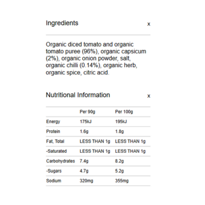 {"id":9486878802216,"title":"Spiral Foods Pasta Sauce - Arrabbiata Organic 375g","handle":"spiral-foods-pasta-sauce-arrabbiata-organic-375g","description":"\u003cp\u003e \u003c\/p\u003e\n\u003ch5\u003eReviews\u003c\/h5\u003e\n\u003cp\u003eReviews go here\u003c\/p\u003e\n\u003ch5\u003eIngredients\u003c\/h5\u003e\n\u003cp\u003eAny images, tags, filters, product categories, and any other information on this website showing ingredients, nutrition panels, or allergy statements are for guidance only, as manufacturers often change their formulations without notice. Please contact the manufacturer for the most up-to-date ingredient information, or email us to confirm the ingredients of the stock currently on hand.\u003c\/p\u003e","published_at":"2025-03-05T12:37:13+11:00","created_at":"2024-11-07T16:48:23+11:00","vendor":"Spiral Foods","type":"General","tags":["Cooking Sauces","Pasta","Savoury Sauces","Sydney Store"],"price":556,"price_min":556,"price_max":556,"available":true,"price_varies":false,"compare_at_price":null,"compare_at_price_min":0,"compare_at_price_max":0,"compare_at_price_varies":false,"variants":[{"id":49487096316200,"title":"Default Title","option1":"Default Title","option2":null,"option3":null,"sku":"9312336790014","requires_shipping":true,"taxable":false,"featured_image":null,"available":true,"name":"Spiral Foods Pasta Sauce - Arrabbiata Organic 375g","public_title":null,"options":["Default Title"],"price":556,"weight":0,"compare_at_price":null,"inventory_quantity":4,"inventory_management":"shopify","inventory_policy":"deny","barcode":null,"requires_selling_plan":false,"selling_plan_allocations":[]}],"images":["\/\/crueltyfreeshop.com.au\/cdn\/shop\/files\/Spiral_Pasta-Sauce_Arrabbiata_Organic_375g_Front_2000x2000px.jpg?v=1730958503","\/\/crueltyfreeshop.com.au\/cdn\/shop\/files\/SpiralArrabbiata-NutritionalInformation.png?v=1764552787"],"featured_image":"\/\/crueltyfreeshop.com.au\/cdn\/shop\/files\/Spiral_Pasta-Sauce_Arrabbiata_Organic_375g_Front_2000x2000px.jpg?v=1730958503","options":["Title"],"media":[{"alt":null,"id":40433959502120,"position":1,"preview_image":{"aspect_ratio":1.0,"height":2000,"width":2000,"src":"\/\/crueltyfreeshop.com.au\/cdn\/shop\/files\/Spiral_Pasta-Sauce_Arrabbiata_Organic_375g_Front_2000x2000px.jpg?v=1730958503"},"aspect_ratio":1.0,"height":2000,"media_type":"image","src":"\/\/crueltyfreeshop.com.au\/cdn\/shop\/files\/Spiral_Pasta-Sauce_Arrabbiata_Organic_375g_Front_2000x2000px.jpg?v=1730958503","width":2000},{"alt":null,"id":43112059732264,"position":2,"preview_image":{"aspect_ratio":1.0,"height":400,"width":400,"src":"\/\/crueltyfreeshop.com.au\/cdn\/shop\/files\/SpiralArrabbiata-NutritionalInformation.png?v=1764552787"},"aspect_ratio":1.0,"height":400,"media_type":"image","src":"\/\/crueltyfreeshop.com.au\/cdn\/shop\/files\/SpiralArrabbiata-NutritionalInformation.png?v=1764552787","width":400}],"requires_selling_plan":false,"selling_plan_groups":[],"content":"\u003cp\u003e \u003c\/p\u003e\n\u003ch5\u003eReviews\u003c\/h5\u003e\n\u003cp\u003eReviews go here\u003c\/p\u003e\n\u003ch5\u003eIngredients\u003c\/h5\u003e\n\u003cp\u003eAny images, tags, filters, product categories, and any other information on this website showing ingredients, nutrition panels, or allergy statements are for guidance only, as manufacturers often change their formulations without notice. Please contact the manufacturer for the most up-to-date ingredient information, or email us to confirm the ingredients of the stock currently on hand.\u003c\/p\u003e"}