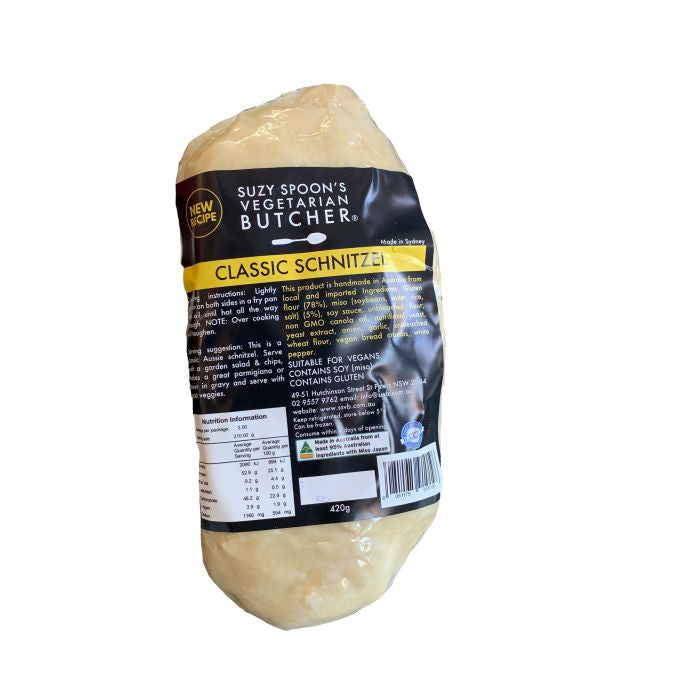 {"id":7325392928925,"title":"Suzy Spoons Classic Schnitzel 2pk 420g (cold)","handle":"suzyspoonsclassicschnitzelcold-case-6","description":"\u003cp\u003eThese Seitan Schnitzels are delicious for lunch on a sandwich with lettuce and vegan mayo or treat yourself to full Viennese dinner of schnitzel, potato salad, sauerkraut and cranberry sauce. Bake, grill or fry them!\u003c\/p\u003e\n\u003cp\u003e**This product is dispatched frozen, though will thaw in transit. Upon the arrival of your delivery, put it in the fridge for 12 days shelf life**\u003c\/p\u003e\n\u003cp\u003eCOOKING INSTRUCTIONS :\u003c\/p\u003e\n\u003cp\u003eAdd oil to a pan and cook all over until brown, you can also cook in the oven or BBQ. Tip - the longer you cook it the chewier the texture gets. Can also be cooked in the oven or grilled.\u003c\/p\u003e\n\u003c!-- TABS --\u003e\n\u003ch5\u003eReviews\u003c\/h5\u003e\n\u003cp\u003eReviews go here\u003c\/p\u003e\n\u003ch5\u003eIngredients\u003c\/h5\u003e\n\u003cp\u003eAny images, tags, filters, product categories, and any other information on this website showing ingredients, nutrition panels, or allergy statements are for guidance only, as manufacturers often change their formulations without notice. Please contact the manufacturer for the most up-to-date ingredient information, or email us to confirm the ingredients of the stock currently on hand.\u003c\/p\u003e\n\u003ch5\u003eImportant Shipping Note\u003c\/h5\u003e\n\u003cdiv\u003e\n\u003cspan\u003eAll orders containing chilled products, frozen products and chocolates must include a Cooler to protect them in transit. The\u003c\/span\u003e\u003cspan\u003e \u003c\/span\u003e\u003cspan\u003eCooler\u003c\/span\u003e\u003cspan\u003e will automatically add to your order when a cold product is added to your shopping cart. \u003c\/span\u003e\u003cspan\u003eFrozen items may defrost in transit, we can not recommend re-freezing. \u003c\/span\u003e\u003cspan\u003eWe will select the correct size cooler for your order. Chilled orders can only be sent to certain areas, please refer to our \u003c\/span\u003e\u003ca href=\"https:\/\/www.crueltyfreeshop.com.au\/pages\/faq#refrid\" rel=\"noopener\" target=\"_blank\" data-saferedirecturl=\"https:\/\/www.google.com\/url?q=https:\/\/www.crueltyfreeshop.com.au\/pages\/faq%23refrid\u0026amp;source=gmail\u0026amp;ust=1664430462005000\u0026amp;usg=AOvVaw3YpBIvhTwoxQRA_PVqbP_L\"\u003eFAQ\u003c\/a\u003e\u003cspan\u003e or email us at \u003c\/span\u003e\u003ca href=\"mailto:online@vegangrocerystore.com.au\" rel=\"noopener\" target=\"_blank\"\u003eonline@vegangrocerystore.\u003cwbr\u003ecom.au\u003c\/wbr\u003e\u003c\/a\u003e\n\u003c\/div\u003e","published_at":"2025-09-15T16:30:43+10:00","created_at":"2022-03-23T13:50:21+11:00","vendor":"Suzy Spoons","type":"Refrig food (GST Free)","tags":["Chicken","Sydney Store"],"price":1395,"price_min":1395,"price_max":1395,"available":true,"price_varies":false,"compare_at_price":null,"compare_at_price_min":0,"compare_at_price_max":0,"compare_at_price_varies":false,"variants":[{"id":42126938308765,"title":"Default Title","option1":"Default Title","option2":null,"option3":null,"sku":"081175910196","requires_shipping":true,"taxable":false,"featured_image":null,"available":true,"name":"Suzy Spoons Classic Schnitzel 2pk 420g (cold)","public_title":null,"options":["Default Title"],"price":1395,"weight":420,"compare_at_price":null,"inventory_quantity":4,"inventory_management":"shopify","inventory_policy":"deny","barcode":"","requires_selling_plan":false,"selling_plan_allocations":[]}],"images":["\/\/crueltyfreeshop.com.au\/cdn\/shop\/files\/SZSP1070R.jpg?v=1765854800","\/\/crueltyfreeshop.com.au\/cdn\/shop\/files\/suzyschnit-NutritionalInfo_629d9993-000c-4d8c-bf43-017214cbe853.jpg?v=1765854800","\/\/crueltyfreeshop.com.au\/cdn\/shop\/files\/suzyschnitz-ingredients_42406847-f09e-41d1-823c-0d2a252bbeef.jpg?v=1765854800","\/\/crueltyfreeshop.com.au\/cdn\/shop\/products\/SuzySpoonsCrumbedSchnitzel2pk_cold_1.jpg?v=1765854800","\/\/crueltyfreeshop.com.au\/cdn\/shop\/products\/SuzySpoonsCrumbedSchnitzel2pk_cold_300g12.jpg?v=1765854800"],"featured_image":"\/\/crueltyfreeshop.com.au\/cdn\/shop\/files\/SZSP1070R.jpg?v=1765854800","options":["Title"],"media":[{"alt":null,"id":43185921032488,"position":1,"preview_image":{"aspect_ratio":1.0,"height":700,"width":700,"src":"\/\/crueltyfreeshop.com.au\/cdn\/shop\/files\/SZSP1070R.jpg?v=1765854800"},"aspect_ratio":1.0,"height":700,"media_type":"image","src":"\/\/crueltyfreeshop.com.au\/cdn\/shop\/files\/SZSP1070R.jpg?v=1765854800","width":700},{"alt":null,"id":43020491784488,"position":2,"preview_image":{"aspect_ratio":1.0,"height":400,"width":400,"src":"\/\/crueltyfreeshop.com.au\/cdn\/shop\/files\/suzyschnit-NutritionalInfo_629d9993-000c-4d8c-bf43-017214cbe853.jpg?v=1765854800"},"aspect_ratio":1.0,"height":400,"media_type":"image","src":"\/\/crueltyfreeshop.com.au\/cdn\/shop\/files\/suzyschnit-NutritionalInfo_629d9993-000c-4d8c-bf43-017214cbe853.jpg?v=1765854800","width":400},{"alt":null,"id":43020491817256,"position":3,"preview_image":{"aspect_ratio":1.0,"height":400,"width":400,"src":"\/\/crueltyfreeshop.com.au\/cdn\/shop\/files\/suzyschnitz-ingredients_42406847-f09e-41d1-823c-0d2a252bbeef.jpg?v=1765854800"},"aspect_ratio":1.0,"height":400,"media_type":"image","src":"\/\/crueltyfreeshop.com.au\/cdn\/shop\/files\/suzyschnitz-ingredients_42406847-f09e-41d1-823c-0d2a252bbeef.jpg?v=1765854800","width":400},{"alt":null,"id":24657643012253,"position":4,"preview_image":{"aspect_ratio":1.0,"height":1000,"width":1000,"src":"\/\/crueltyfreeshop.com.au\/cdn\/shop\/products\/SuzySpoonsCrumbedSchnitzel2pk_cold_1.jpg?v=1765854800"},"aspect_ratio":1.0,"height":1000,"media_type":"image","src":"\/\/crueltyfreeshop.com.au\/cdn\/shop\/products\/SuzySpoonsCrumbedSchnitzel2pk_cold_1.jpg?v=1765854800","width":1000},{"alt":null,"id":24657649402013,"position":5,"preview_image":{"aspect_ratio":1.0,"height":1000,"width":1000,"src":"\/\/crueltyfreeshop.com.au\