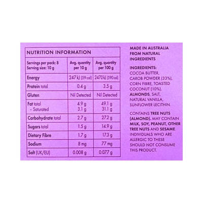 {"id":9701086855464,"title":"The Carob Kitchen Carob Bar Vegan Coconut 80g (cold)","handle":"the-carob-kitchen-carob-bar-vegan-coconut-80g","description":"\u003cp\u003e \u003c\/p\u003e\n\u003ch5\u003eReviews\u003c\/h5\u003e\n\u003cp\u003eReviews go here\u003c\/p\u003e\n\u003ch5\u003eIngredients\u003c\/h5\u003e\n\u003cp\u003eAny images, tags, filters, product categories, and any other information on this website showing ingredients, nutrition panels, or allergy statements are for guidance only, as manufacturers often change their formulations without notice. Please contact the manufacturer for the most up-to-date ingredient information, or email us to confirm the ingredients of the stock currently on hand.\u003c\/p\u003e\n\u003ch5\u003eImportant Shipping Note\u003c\/h5\u003e\n\u003cdiv\u003e\n\u003cspan\u003eAll orders containing chilled products, frozen products and chocolates must include a Cooler to protect them in transit. The\u003c\/span\u003e\u003cspan\u003e \u003c\/span\u003e\u003cspan\u003eCooler\u003c\/span\u003e\u003cspan\u003e will automatically add to your order when a cold product is added to your shopping cart. \u003c\/span\u003e\u003cspan\u003eFrozen items may defrost in transit, we can not recommend re-freezing. \u003c\/span\u003e\u003cspan\u003eWe will select the correct size cooler for your order. Chilled orders can only be sent to certain areas, please refer to our \u003c\/span\u003e\u003ca href=\"https:\/\/www.crueltyfreeshop.com.au\/pages\/faq#refrid\" rel=\"noopener\" target=\"_blank\" data-saferedirecturl=\"https:\/\/www.google.com\/url?q=https:\/\/www.crueltyfreeshop.com.au\/pages\/faq%23refrid\u0026amp;source=gmail\u0026amp;ust=1664430462005000\u0026amp;usg=AOvVaw3YpBIvhTwoxQRA_PVqbP_L\"\u003eFAQ\u003c\/a\u003e\u003cspan\u003e or email us at \u003c\/span\u003e\u003ca href=\"mailto:online@vegangrocerystore.com.au\" rel=\"noopener\" target=\"_blank\"\u003eonline@vegangrocerystore.\u003cwbr\u003ecom.au\u003c\/wbr\u003e\u003c\/a\u003e\n\u003c\/div\u003e","published_at":"2025-11-21T15:54:08+11:00","created_at":"2025-07-09T09:19:59+10:00","vendor":"The Carob Kitchen","type":"","tags":["Carob","Chocolate","Sydney Store"],"price":885,"price_min":885,"price_max":885,"available":true,"price_varies":false,"compare_at_price":null,"compare_at_price_min":0,"compare_at_price_max":0,"compare_at_price_varies":false,"variants":[{"id":50366120067368,"title":"Default Title","option1":"Default Title","option2":null,"option3":null,"sku":"9354396000085","requires_shipping":true,"taxable":true,"featured_image":null,"available":true,"name":"The Carob Kitchen Carob Bar Vegan Coconut 80g (cold)","public_title":null,"options":["Default Title"],"price":885,"weight":0,"compare_at_price":null,"inventory_quantity":3,"inventory_management":"shopify","inventory_policy":"deny","barcode":null,"requires_selling_plan":false,"selling_plan_allocations":[]}],"images":["\/\/crueltyfreeshop.com.au\/cdn\/shop\/files\/CARB146.jpg?v=1752016802","\/\/crueltyfreeshop.com.au\/cdn\/shop\/files\/carobbarcoconut-NutritionalInfo.jpg?v=1763959936"],"featured_image":"\/\/crueltyfreeshop.com.au\/cdn\/shop\/files\/CARB146.jpg?v=1752016802","options":["Title"],"media":[{"alt":null,"id":41852855222568,"position":1,"preview_image":{"aspect_ratio":0.479,"height":1000,"width":479,"src":"\/\/crueltyfreeshop.com.au\/cdn\/shop\/files\/CARB146.jpg?v=1752016802"},"aspect_ratio":0.479,"height":1000,"media_type":"image","src":"\/\/crueltyfreeshop.com.au\/cdn\/shop\/files\/CARB146.jpg?v=1752016802","width":479},{"alt":null,"id":43044721099048,"position":2,"preview_image":{"aspect_ratio":1.0,"height":400,"width":400,"src":"\/\/crueltyfreeshop.com.au\/cdn\/shop\/files\/carobbarcoconut-NutritionalInfo.jpg?v=1763959936"},"aspect_ratio":1.0,"height":400,"media_type":"image","src":"\/\/crueltyfreeshop.com.au\/cdn\/shop\/files\/carobbarcoconut-NutritionalInfo.jpg?v=1763959936","width":400}],"requires_selling_plan":false,"selling_plan_groups":[],"content":"\u003cp\u003e \u003c\/p\u003e\n\u003ch5\u003eReviews\u003c\/h5\u003e\n\u003cp\u003eReviews go here\u003c\/p\u003e\n\u003ch5\u003eIngredients\u003c\/h5\u003e\n\u003cp\u003eAny images, tags, filters, product categories, and any other information on this website showing ingredients, nutrition panels, or allergy statements are for guidance only, as manufacturers often change their formulations without notice. Please contact the manufacturer for the most up-to-date ingredient information, or email us to confirm the ingredients of the stock currently on hand.\u003c\/p\u003e\n\u003ch5\u003eImportant Shipping Note\u003c\/h5\u003e\n\u003cdiv\u003e\n\u003cspan\u003eAll orders containing chilled products, frozen products and chocolates must include a Cooler to protect them in transit. The\u003c\/span\u003e\u003cspan\u003e \u003c\/span\u003e\u003cspan\u003eCooler\u003c\/span\u003e\u003cspan\u003e will automatically add to your order when a cold product is added to your shopping cart. \u003c\/span\u003e\u003cspan\u003eFrozen items may defrost in transit, we can not recommend re-freezing. \u003c\/span\u003e\u003cspan\u003eWe will select the correct size cooler for your order. Chilled orders can only be sent to certain areas, please refer to our \u003c\/span\u003e\u003ca href=\"https:\/\/www.crueltyfreeshop.com.au\/pages\/faq#refrid\" rel=\"noopener\" target=\"_blank\" data-saferedirecturl=\"https:\/\/www.google.com\/url?q=https:\/\/www.crueltyfreeshop.com.au\/pages\/faq%23refrid\u0026amp;source=gmail\u0026amp;ust=1664430462005000\u0026amp;usg=AOvVaw3YpBIvhTwoxQRA_PVqbP_L\"\u003eFAQ\u003c\/a\u003e\u003cspan\u003e or email us at \u003c\/span\u003e\u003ca href=\"mailto:online@vegangrocerystore.com.au\" rel=\"noopener\" target=\"_blank\"\u003eonline@vegangrocerystore.\u003cwbr\u003ecom.au\u003c\/wbr\u003e\u003c\/a\u003e\n\u003c\/div\u003e"}