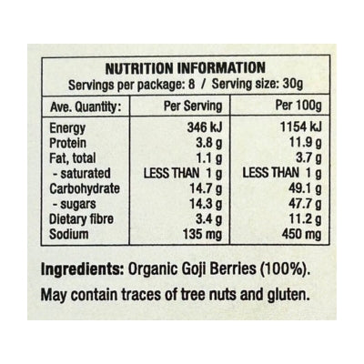 {"id":9486844985640,"title":"Chefs Choice Organic Goji Berries 250g","handle":"chefs-choice-organic-goji-berries-250g","description":"\u003cp\u003e \u003c\/p\u003e\n\u003ch5\u003eReviews\u003c\/h5\u003e\n\u003cp\u003eReviews go here\u003c\/p\u003e\n\u003ch5\u003eIngredients\u003c\/h5\u003e\n\u003cp\u003eAny images, tags, filters, product categories, and any other information on this website showing ingredients, nutrition panels, or allergy statements are for guidance only, as manufacturers often change their formulations without notice. Please contact the manufacturer for the most up-to-date ingredient information, or email us to confirm the ingredients of the stock currently on hand.\u003c\/p\u003e","published_at":"2025-07-16T15:01:29+10:00","created_at":"2024-11-07T14:14:31+11:00","vendor":"Chef's Choice","type":"General","tags":["Dried Fruit","Sydney Store"],"price":1060,"price_min":1060,"price_max":1060,"available":true,"price_varies":false,"compare_at_price":null,"compare_at_price_min":0,"compare_at_price_max":0,"compare_at_price_varies":false,"variants":[{"id":49486853538088,"title":"Default Title","option1":"Default Title","option2":null,"option3":null,"sku":"9339337304309","requires_shipping":true,"taxable":false,"featured_image":null,"available":true,"name":"Chefs Choice Organic Goji Berries 250g","public_title":null,"options":["Default Title"],"price":1060,"weight":0,"compare_at_price":null,"inventory_quantity":4,"inventory_management":"shopify","inventory_policy":"deny","barcode":null,"requires_selling_plan":false,"selling_plan_allocations":[]}],"images":["\/\/www.crueltyfreeshop.com.au\/cdn\/shop\/files\/Certified-Organic-Goji-Berries.jpg?v=1730949271","\/\/www.crueltyfreeshop.com.au\/cdn\/shop\/files\/chefschoicegoji-NutritionalInformation.jpg?v=1764561107"],"featured_image":"\/\/www.crueltyfreeshop.com.au\/cdn\/shop\/files\/Certified-Organic-Goji-Berries.jpg?v=1730949271","options":["Title"],"media":[{"alt":null,"id":40433565008168,"position":1,"preview_image":{"aspect_ratio":1.0,"height":1000,"width":1000,"src":"\/\/www.crueltyfreeshop.com.au\/cdn\/shop\/files\/Certified-Organic-Goji-Berries.jpg?v=1730949271"},"aspect_ratio":1.0,"height":1000,"media_type":"image","src":"\/\/www.crueltyfreeshop.com.au\/cdn\/shop\/files\/Certified-Organic-Goji-Berries.jpg?v=1730949271","width":1000},{"alt":null,"id":43112604139816,"position":2,"preview_image":{"aspect_ratio":1.0,"height":400,"width":400,"src":"\/\/www.crueltyfreeshop.com.au\/cdn\/shop\/files\/chefschoicegoji-NutritionalInformation.jpg?v=1764561107"},"aspect_ratio":1.0,"height":400,"media_type":"image","src":"\/\/www.crueltyfreeshop.com.au\/cdn\/shop\/files\/chefschoicegoji-NutritionalInformation.jpg?v=1764561107","width":400}],"requires_selling_plan":false,"selling_plan_groups":[],"content":"\u003cp\u003e \u003c\/p\u003e\n\u003ch5\u003eReviews\u003c\/h5\u003e\n\u003cp\u003eReviews go here\u003c\/p\u003e\n\u003ch5\u003eIngredients\u003c\/h5\u003e\n\u003cp\u003eAny images, tags, filters, product categories, and any other information on this website showing ingredients, nutrition panels, or allergy statements are for guidance only, as manufacturers often change their formulations without notice. Please contact the manufacturer for the most up-to-date ingredient information, or email us to confirm the ingredients of the stock currently on hand.\u003c\/p\u003e"}