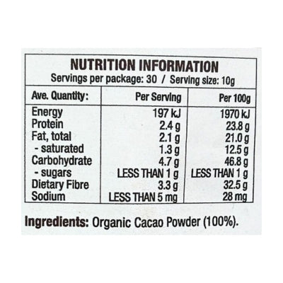 {"id":9486850621736,"title":"Chefs Choice Organic Raw Cacao - Powder 300g","handle":"chefs-choice-organic-raw-cacao-powder-300g","description":"\u003cp\u003e \u003c\/p\u003e\n\u003ch5\u003eReviews\u003c\/h5\u003e\n\u003cp\u003eReviews go here\u003c\/p\u003e\n\u003ch5\u003eIngredients\u003c\/h5\u003e\n\u003cp\u003eAny images, tags, filters, product categories, and any other information on this website showing ingredients, nutrition panels, or allergy statements are for guidance only, as manufacturers often change their formulations without notice. Please contact the manufacturer for the most up-to-date ingredient information, or email us to confirm the ingredients of the stock currently on hand.\u003c\/p\u003e","published_at":"2025-03-05T13:32:34+11:00","created_at":"2024-11-07T14:41:22+11:00","vendor":"Chef's Choice","type":"General","tags":["Baking","Beverages","Health Food","Sydney Store"],"price":1286,"price_min":1286,"price_max":1286,"available":true,"price_varies":false,"compare_at_price":null,"compare_at_price_min":0,"compare_at_price_max":0,"compare_at_price_varies":false,"variants":[{"id":49486897774888,"title":"Default Title","option1":"Default Title","option2":null,"option3":null,"sku":"9339337003424","requires_shipping":true,"taxable":false,"featured_image":null,"available":true,"name":"Chefs Choice Organic Raw Cacao - Powder 300g","public_title":null,"options":["Default Title"],"price":1286,"weight":0,"compare_at_price":null,"inventory_quantity":7,"inventory_management":"shopify","inventory_policy":"deny","barcode":null,"requires_selling_plan":false,"selling_plan_allocations":[]}],"images":["\/\/www.crueltyfreeshop.com.au\/cdn\/shop\/files\/Certified-Organic-Raw-Cacao-Powder-300g.jpg?v=1730950882","\/\/www.crueltyfreeshop.com.au\/cdn\/shop\/files\/chef_schoicerawcacaopowder-NutritionalInformation_d93451bc-2ffe-4f7b-bab0-9fb7b30685b5.jpg?v=1764558336"],"featured_image":"\/\/www.crueltyfreeshop.com.au\/cdn\/shop\/files\/Certified-Organic-Raw-Cacao-Powder-300g.jpg?v=1730950882","options":["Title"],"media":[{"alt":null,"id":40433628479784,"position":1,"preview_image":{"aspect_ratio":1.0,"height":800,"width":800,"src":"\/\/www.crueltyfreeshop.com.au\/cdn\/shop\/files\/Certified-Organic-Raw-Cacao-Powder-300g.jpg?v=1730950882"},"aspect_ratio":1.0,"height":800,"media_type":"image","src":"\/\/www.crueltyfreeshop.com.au\/cdn\/shop\/files\/Certified-Organic-Raw-Cacao-Powder-300g.jpg?v=1730950882","width":800},{"alt":null,"id":43112464482600,"position":2,"preview_image":{"aspect_ratio":1.0,"height":400,"width":400,"src":"\/\/www.crueltyfreeshop.com.au\/cdn\/shop\/files\/chef_schoicerawcacaopowder-NutritionalInformation_d93451bc-2ffe-4f7b-bab0-9fb7b30685b5.jpg?v=1764558336"},"aspect_ratio":1.0,"height":400,"media_type":"image","src":"\/\/www.crueltyfreeshop.com.au\/cdn\/shop\/files\/chef_schoicerawcacaopowder-NutritionalInformation_d93451bc-2ffe-4f7b-bab0-9fb7b30685b5.jpg?v=1764558336","width":400}],"requires_selling_plan":false,"selling_plan_groups":[],"content":"\u003cp\u003e \u003c\/p\u003e\n\u003ch5\u003eReviews\u003c\/h5\u003e\n\u003cp\u003eReviews go here\u003c\/p\u003e\n\u003ch5\u003eIngredients\u003c\/h5\u003e\n\u003cp\u003eAny images, tags, filters, product categories, and any other information on this website showing ingredients, nutrition panels, or allergy statements are for guidance only, as manufacturers often change their formulations without notice. Please contact the manufacturer for the most up-to-date ingredient information, or email us to confirm the ingredients of the stock currently on hand.\u003c\/p\u003e"}