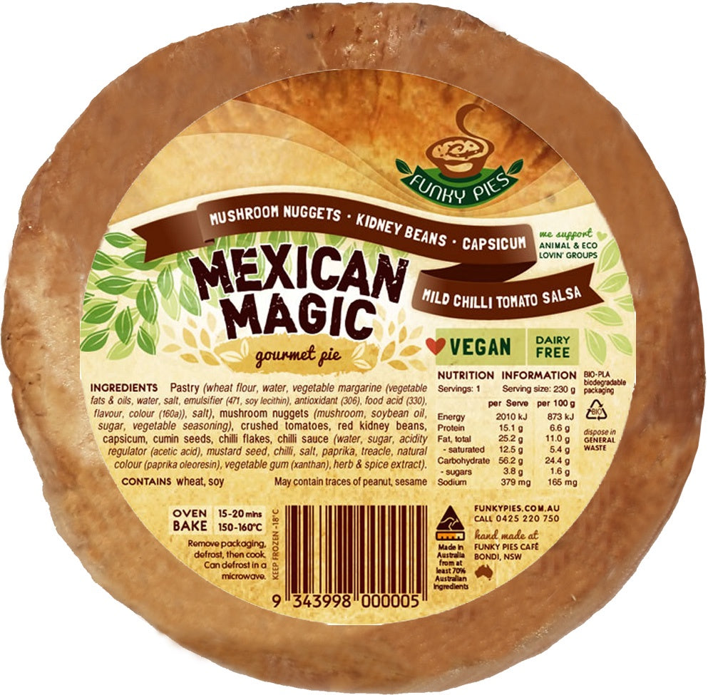 {"id":9431389634856,"title":"Funky Pie - Mexican Magic 230g (cold)","handle":"funky-pies-mexican-magic-cold","description":"\u003cp\u003eA delicious combination of meaty mushroom nuggets in a hot tomato salsa with capsicum and kidney beans.\u003c\/p\u003e\n\u003cp\u003eMay defrost in transit, we do not recommend re-freezing.\u003c\/p\u003e\n\u003ch5\u003eReviews\u003c\/h5\u003e\n\u003cp\u003eReviews go here\u003c\/p\u003e\n\u003ch5\u003eIngredients\u003c\/h5\u003e\n\u003cp\u003eAny images, tags, filters, product categories, and any other information on this website showing ingredients, nutrition panels, or allergy statements are for guidance only, as manufacturers often change their formulations without notice. Please contact the manufacturer for the most up-to-date ingredient information, or email us to confirm the ingredients of the stock currently on hand.\u003c\/p\u003e\n\u003ch5\u003eImportant Shipping Note\u003c\/h5\u003e\n\u003cdiv\u003e\n\u003cspan\u003eAll orders containing chilled products, frozen products and chocolates must include a Cooler to protect them in transit. The\u003c\/span\u003e\u003cspan\u003e \u003c\/span\u003e\u003cspan\u003eCooler\u003c\/span\u003e\u003cspan\u003e will automatically add to your order when a cold product is added to your shopping cart. \u003c\/span\u003e\u003cspan\u003eFrozen items may defrost in transit, we can not recommend re-freezing. \u003c\/span\u003e\u003cspan\u003eWe will select the correct size cooler for your order. Chilled orders can only be sent to certain areas, please refer to our \u003c\/span\u003e\u003ca href=\"https:\/\/www.crueltyfreeshop.com.au\/pages\/faq#refrid\" rel=\"noopener\" target=\"_blank\" data-saferedirecturl=\"https:\/\/www.google.com\/url?q=https:\/\/www.crueltyfreeshop.com.au\/pages\/faq%23refrid\u0026amp;source=gmail\u0026amp;ust=1664430462005000\u0026amp;usg=AOvVaw3YpBIvhTwoxQRA_PVqbP_L\"\u003eFAQ\u003c\/a\u003e\u003cspan\u003e or email us at \u003c\/span\u003e\u003ca href=\"mailto:online@vegangrocerystore.com.au\" rel=\"noopener\" target=\"_blank\"\u003eonline@vegangrocerystore.\u003cwbr\u003ecom.au\u003c\/wbr\u003e\u003c\/a\u003e\n\u003c\/div\u003e","published_at":"2025-03-05T13:36:24+11:00","created_at":"2024-09-09T12:40:53+10:00","vendor":"Funky Pies","type":"Refrig food","tags":["Pies","Sydney Store"],"price":783,"price_min":783,"price_max":783,"available":true,"price_varies":false,"compare_at_price":null,"compare_at_price_min":0,"compare_at_price_max":0,"compare_at_price_varies":false,"variants":[{"id":49202166628648,"title":"Default Title","option1":"Default Title","option2":null,"option3":null,"sku":"9343998000005","requires_shipping":true,"taxable":true,"featured_image":null,"available":true,"name":"Funky Pie - Mexican Magic 230g (cold)","public_title":null,"options":["Default Title"],"price":783,"weight":0,"compare_at_price":null,"inventory_quantity":1,"inventory_management":"shopify","inventory_policy":"deny","barcode":null,"requires_selling_plan":false,"selling_plan_allocations":[]}],"images":["\/\/www.crueltyfreeshop.com.au\/cdn\/shop\/files\/Mexican-Magic-Pie.jpg?v=1725849653","\/\/www.crueltyfreeshop.com.au\/cdn\/shop\/files\/mexicanmagic-NutritionalInfo.jpg?v=1763610427","\/\/www.crueltyfreeshop.com.au\/cdn\/shop\/files\/mexicanmagic-ingredients.jpg?v=1763610428"],"featured_image":"\/\/www.crueltyfreeshop.com.au\/cdn\/shop\/files\/Mexican-Magic-Pie.jpg?v=1725849653","options":["Title"],"media":[{"alt":null,"id":40008300757288,"position":1,"preview_image":{"aspect_ratio":1.026,"height":975,"width":1000,"src":"\/\/www.crueltyfreeshop.com.au\/cdn\/shop\/files\/Mexican-Magic-Pie.jpg?v=1725849653"},"aspect_ratio":1.026,"height":975,"media_type":"image","src":"\/\/www.crueltyfreeshop.com.au\/cdn\/shop\/files\/Mexican-Magic-Pie.jpg?v=1725849653","width":1000},{"alt":null,"id":43015557972264,"position":2,"preview_image":{"aspect_ratio":1.0,"height":400,"width":400,"src":"\/\/www.crueltyfreeshop.com.au\/cdn\/shop\/files\/mexicanmagic-NutritionalInfo.jpg?v=1763610427"},"aspect_ratio":1.0,"height":400,"media_type":"image","src":"\/\/www.crueltyfreeshop.com.au\/cdn\/shop\/files\/mexicanmagic-NutritionalInfo.jpg?v=1763610427","width":400},{"alt":null,"id":43015558005032,"position":3,"preview_image":{"aspect_ratio":1.0,"height":400,"width":400,"src":"\/\/www.crueltyfreeshop.com.au\/cdn\/shop\/files\/mexicanmagic-ingredients.jpg?v=1763610428"},"aspect_ratio":1.0,"height":400,"media_type":"image","src":"\/\/www.crueltyfreeshop.com.au\/cdn\/shop\/files\/mexicanmagic-ingredients.jpg?v=1763610428","width":400}],"requires_selling_plan":false,"selling_plan_groups":[],"content":"\u003cp\u003eA delicious combination of meaty mushroom nuggets in a hot tomato salsa with capsicum and kidney beans.\u003c\/p\u003e\n\u003cp\u003eMay defrost in transit, we do not recommend re-freezing.\u003c\/p\u003e\n\u003ch5\u003eReviews\u003c\/h5\u003e\n\u003cp\u003eReviews go here\u003c\/p\u003e\n\u003ch5\u003eIngredients\u003c\/h5\u003e\n\u003cp\u003eAny images, tags, filters, product categories, and any other information on this website showing ingredients, nutrition panels, or allergy statements are for guidance only, as manufacturers often change their formulations without notice. Please contact the manufacturer for the most up-to-date ingredient information, or email us to confirm the ingredients of the stock currently on hand.\u003c\/p\u003e\n\u003ch5\u003eImportant Shipping Note\u003c\/h5\u003e\n\u003cdiv\u003e\n\u003cspan\u003eAll orders containing chilled products, frozen products and chocolates must include a Cooler to protect them in transit. The\u003c\/span\u003e\u003cspan\u003e \u003c\/span\u003e\u003cspan\u003eCooler\u003c\/span\u003e\u003cspan\u003e will automatically add to your order when a cold product is added to your shopping cart. \u003c\/span\u003e\u003cspan\u003eFrozen items may defrost in transit, we can not recommend re-freezing. \u003c\/span\u003e\u003cspan\u003eWe will select the correct size cooler for your or