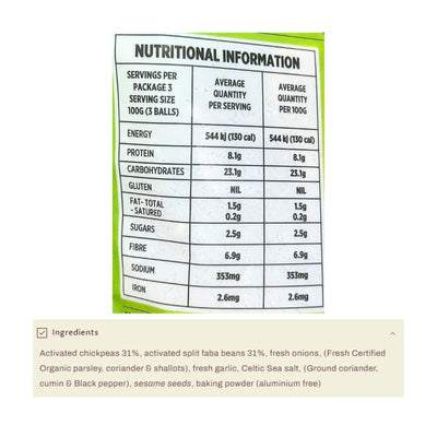 {"id":10109256466728,"title":"Nanna's GF Oil Free Falafels 300g","handle":"nannas-gf-oil-free-falafels-300g","description":"\u003cul\u003e\n\u003cli\u003e100% Oil \u0026amp; Gluten Free\u003c\/li\u003e\n\u003cli\u003eVegan Friendly\u003c\/li\u003e\n\u003cli\u003eMade from 100% Whole Foods\u003c\/li\u003e\n\u003cli\u003eCeltic Sea Salt for 82 added minerals\u003c\/li\u003e\n\u003cli\u003e9 Falafel balls\u003c\/li\u003e\n\u003cli\u003eBake or fry from frozen\u003c\/li\u003e\n\u003cli\u003eMakes 3 Bondi famous wraps\u003c\/li\u003e\n\u003c\/ul\u003e","published_at":"2025-12-19T16:42:03+11:00","created_at":"2025-12-19T16:42:03+11:00","vendor":"Nanna's Falafel","type":"","tags":["Appetisers","Ready Made Meals","Sydney Store"],"price":1190,"price_min":1190,"price_max":1190,"available":true,"price_varies":false,"compare_at_price":null,"compare_at_price_min":0,"compare_at_price_max":0,"compare_at_price_varies":false,"variants":[{"id":51285416509736,"title":"Default Title","option1":"Default Title","option2":null,"option3":null,"sku":"726436474962","requires_shipping":true,"taxable":false,"featured_image":null,"available":true,"name":"Nanna's GF Oil Free Falafels 300g","public_title":null,"options":["Default Title"],"price":1190,"weight":0,"compare_at_price":null,"inventory_quantity":15,"inventory_management":"shopify","inventory_policy":"deny","barcode":null,"requires_selling_plan":false,"selling_plan_allocations":[]}],"images":["\/\/www.crueltyfreeshop.com.au\/cdn\/shop\/files\/Nana_sFalafel.jpg?v=1766123986","\/\/www.crueltyfreeshop.com.au\/cdn\/shop\/files\/Nanna_sFalafel-NutritionalInfo.jpg?v=1768271435"],"featured_image":"\/\/www.crueltyfreeshop.com.au\/cdn\/shop\/files\/Nana_sFalafel.jpg?v=1766123986","options":["Title"],"media":[{"alt":null,"id":43198663328040,"position":1,"preview_image":{"aspect_ratio":1.0,"height":400,"width":400,"src":"\/\/www.crueltyfreeshop.com.au\/cdn\/shop\/files\/Nana_sFalafel.jpg?v=1766123986"},"aspect_ratio":1.0,"height":400,"media_type":"image","src":"\/\/www.crueltyfreeshop.com.au\/cdn\/shop\/files\/Nana_sFalafel.jpg?v=1766123986","width":400},{"alt":null,"id":43297527857448,"position":2,"preview_image":{"aspect_ratio":1.0,"height":400,"width":400,"src":"\/\/www.crueltyfreeshop.com.au\/cdn\/shop\/files\/Nanna_sFalafel-NutritionalInfo.jpg?v=1768271435"},"aspect_ratio":1.0,"height":400,"media_type":"image","src":"\/\/www.crueltyfreeshop.com.au\/cdn\/shop\/files\/Nanna_sFalafel-NutritionalInfo.jpg?v=1768271435","width":400}],"requires_selling_plan":false,"selling_plan_groups":[],"content":"\u003cul\u003e\n\u003cli\u003e100% Oil \u0026amp; Gluten Free\u003c\/li\u003e\n\u003cli\u003eVegan Friendly\u003c\/li\u003e\n\u003cli\u003eMade from 100% Whole Foods\u003c\/li\u003e\n\u003cli\u003eCeltic Sea Salt for 82 added minerals\u003c\/li\u003e\n\u003cli\u003e9 Falafel balls\u003c\/li\u003e\n\u003cli\u003eBake or fry from frozen\u003c\/li\u003e\n\u003cli\u003eMakes 3 Bondi famous wraps\u003c\/li\u003e\n\u003c\/ul\u003e"}