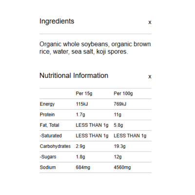 {"id":9486875361576,"title":"Spiral Foods Miso - Genmai Organic 400g","handle":"spiral-foods-miso-genmai-organic-400g","description":"\u003cp\u003e \u003c\/p\u003e\n\u003ch5\u003eReviews\u003c\/h5\u003e\n\u003cp\u003eReviews go here\u003c\/p\u003e\n\u003ch5\u003eIngredients\u003c\/h5\u003e\n\u003cp\u003eAny images, tags, filters, product categories, and any other information on this website showing ingredients, nutrition panels, or allergy statements are for guidance only, as manufacturers often change their formulations without notice. Please contact the manufacturer for the most up-to-date ingredient information, or email us to confirm the ingredients of the stock currently on hand.\u003c\/p\u003e","published_at":"2025-03-05T12:37:56+11:00","created_at":"2024-11-07T16:14:56+11:00","vendor":"Spiral Foods","type":"General","tags":["Broth","Cooking Pastes","Miso","Soups","Sydney Store"],"price":1423,"price_min":1423,"price_max":1423,"available":true,"price_varies":false,"compare_at_price":null,"compare_at_price_min":0,"compare_at_price_max":0,"compare_at_price_varies":false,"variants":[{"id":49487036121384,"title":"Default Title","option1":"Default Title","option2":null,"option3":null,"sku":"9312336013472","requires_shipping":true,"taxable":false,"featured_image":null,"available":true,"name":"Spiral Foods Miso - Genmai Organic 400g","public_title":null,"options":["Default Title"],"price":1423,"weight":0,"compare_at_price":null,"inventory_quantity":2,"inventory_management":"shopify","inventory_policy":"deny","barcode":null,"requires_selling_plan":false,"selling_plan_allocations":[]}],"images":["\/\/www.crueltyfreeshop.com.au\/cdn\/shop\/files\/Spiral_Miso_OrgGenmai.jpg?v=1730956496","\/\/www.crueltyfreeshop.com.au\/cdn\/shop\/files\/SpiralGenmai-NutritionalInformation.png?v=1764552744"],"featured_image":"\/\/www.crueltyfreeshop.com.au\/cdn\/shop\/files\/Spiral_Miso_OrgGenmai.jpg?v=1730956496","options":["Title"],"media":[{"alt":null,"id":40433857954088,"position":1,"preview_image":{"aspect_ratio":1.0,"height":2000,"width":2000,"src":"\/\/www.crueltyfreeshop.com.au\/cdn\/shop\/files\/Spiral_Miso_OrgGenmai.jpg?v=1730956496"},"aspect_ratio":1.0,"height":2000,"media_type":"image","src":"\/\/www.crueltyfreeshop.com.au\/cdn\/shop\/files\/Spiral_Miso_OrgGenmai.jpg?v=1730956496","width":2000},{"alt":null,"id":43112058388776,"position":2,"preview_image":{"aspect_ratio":1.0,"height":400,"width":400,"src":"\/\/www.crueltyfreeshop.com.au\/cdn\/shop\/files\/SpiralGenmai-NutritionalInformation.png?v=1764552744"},"aspect_ratio":1.0,"height":400,"media_type":"image","src":"\/\/www.crueltyfreeshop.com.au\/cdn\/shop\/files\/SpiralGenmai-NutritionalInformation.png?v=1764552744","width":400}],"requires_selling_plan":false,"selling_plan_groups":[],"content":"\u003cp\u003e \u003c\/p\u003e\n\u003ch5\u003eReviews\u003c\/h5\u003e\n\u003cp\u003eReviews go here\u003c\/p\u003e\n\u003ch5\u003eIngredients\u003c\/h5\u003e\n\u003cp\u003eAny images, tags, filters, product categories, and any other information on this website showing ingredients, nutrition panels, or allergy statements are for guidance only, as manufacturers often change their formulations without notice. Please contact the manufacturer for the most up-to-date ingredient information, or email us to confirm the ingredients of the stock currently on hand.\u003c\/p\u003e"}