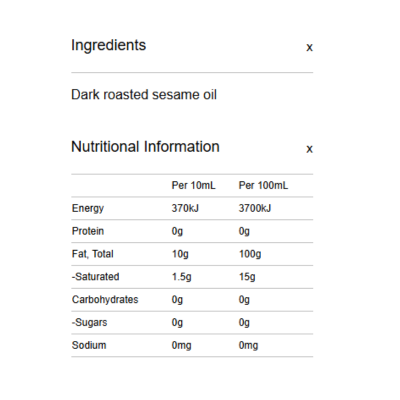 {"id":9488117039400,"title":"Spiral Foods Oil - Japanese Dark Sesame 250ml","handle":"spiral-foods-oil-japanese-dark-sesame-250ml","description":"\u003cp\u003e \u003c\/p\u003e\n\u003ch5\u003eReviews\u003c\/h5\u003e\n\u003cp\u003eReviews go here\u003c\/p\u003e\n\u003ch5\u003eIngredients\u003c\/h5\u003e\n\u003cp\u003eAny images, tags, filters, product categories, and any other information on this website showing ingredients, nutrition panels, or allergy statements are for guidance only, as manufacturers often change their formulations without notice. Please contact the manufacturer for the most up-to-date ingredient information, or email us to confirm the ingredients of the stock currently on hand.\u003c\/p\u003e","published_at":"2025-09-15T16:34:46+10:00","created_at":"2024-11-08T10:32:38+11:00","vendor":"Spiral Foods","type":"General","tags":["Dressings","Oil","Sydney Store"],"price":1080,"price_min":1080,"price_max":1080,"available":true,"price_varies":false,"compare_at_price":null,"compare_at_price_min":0,"compare_at_price_max":0,"compare_at_price_varies":false,"variants":[{"id":49490870698280,"title":"Default Title","option1":"Default Title","option2":null,"option3":null,"sku":"9312336140000","requires_shipping":true,"taxable":false,"featured_image":null,"available":true,"name":"Spiral Foods Oil - Japanese Dark Sesame 250ml","public_title":null,"options":["Default Title"],"price":1080,"weight":0,"compare_at_price":null,"inventory_quantity":3,"inventory_management":"shopify","inventory_policy":"deny","barcode":null,"requires_selling_plan":false,"selling_plan_allocations":[]}],"images":["\/\/www.crueltyfreeshop.com.au\/cdn\/shop\/files\/Spiral_Sauc_SesameOil_1.jpg?v=1731022358","\/\/www.crueltyfreeshop.com.au\/cdn\/shop\/files\/SpiralSesameoil-NutritionalInformation.png?v=1764551175"],"featured_image":"\/\/www.crueltyfreeshop.com.au\/cdn\/shop\/files\/Spiral_Sauc_SesameOil_1.jpg?v=1731022358","options":["Title"],"media":[{"alt":null,"id":40440111235368,"position":1,"preview_image":{"aspect_ratio":1.0,"height":2000,"width":2000,"src":"\/\/www.crueltyfreeshop.com.au\/cdn\/shop\/files\/Spiral_Sauc_SesameOil_1.jpg?v=1731022358"},"aspect_ratio":1.0,"height":2000,"media_type":"image","src":"\/\/www.crueltyfreeshop.com.au\/cdn\/shop\/files\/Spiral_Sauc_SesameOil_1.jpg?v=1731022358","width":2000},{"alt":null,"id":43111958282536,"position":2,"preview_image":{"aspect_ratio":1.0,"height":400,"width":400,"src":"\/\/www.crueltyfreeshop.com.au\/cdn\/shop\/files\/SpiralSesameoil-NutritionalInformation.png?v=1764551175"},"aspect_ratio":1.0,"height":400,"media_type":"image","src":"\/\/www.crueltyfreeshop.com.au\/cdn\/shop\/files\/SpiralSesameoil-NutritionalInformation.png?v=1764551175","width":400}],"requires_selling_plan":false,"selling_plan_groups":[],"content":"\u003cp\u003e \u003c\/p\u003e\n\u003ch5\u003eReviews\u003c\/h5\u003e\n\u003cp\u003eReviews go here\u003c\/p\u003e\n\u003ch5\u003eIngredients\u003c\/h5\u003e\n\u003cp\u003eAny images, tags, filters, product categories, and any other information on this website showing ingredients, nutrition panels, or allergy statements are for guidance only, as manufacturers often change their formulations without notice. Please contact the manufacturer for the most up-to-date ingredient information, or email us to confirm the ingredients of the stock currently on hand.\u003c\/p\u003e"}