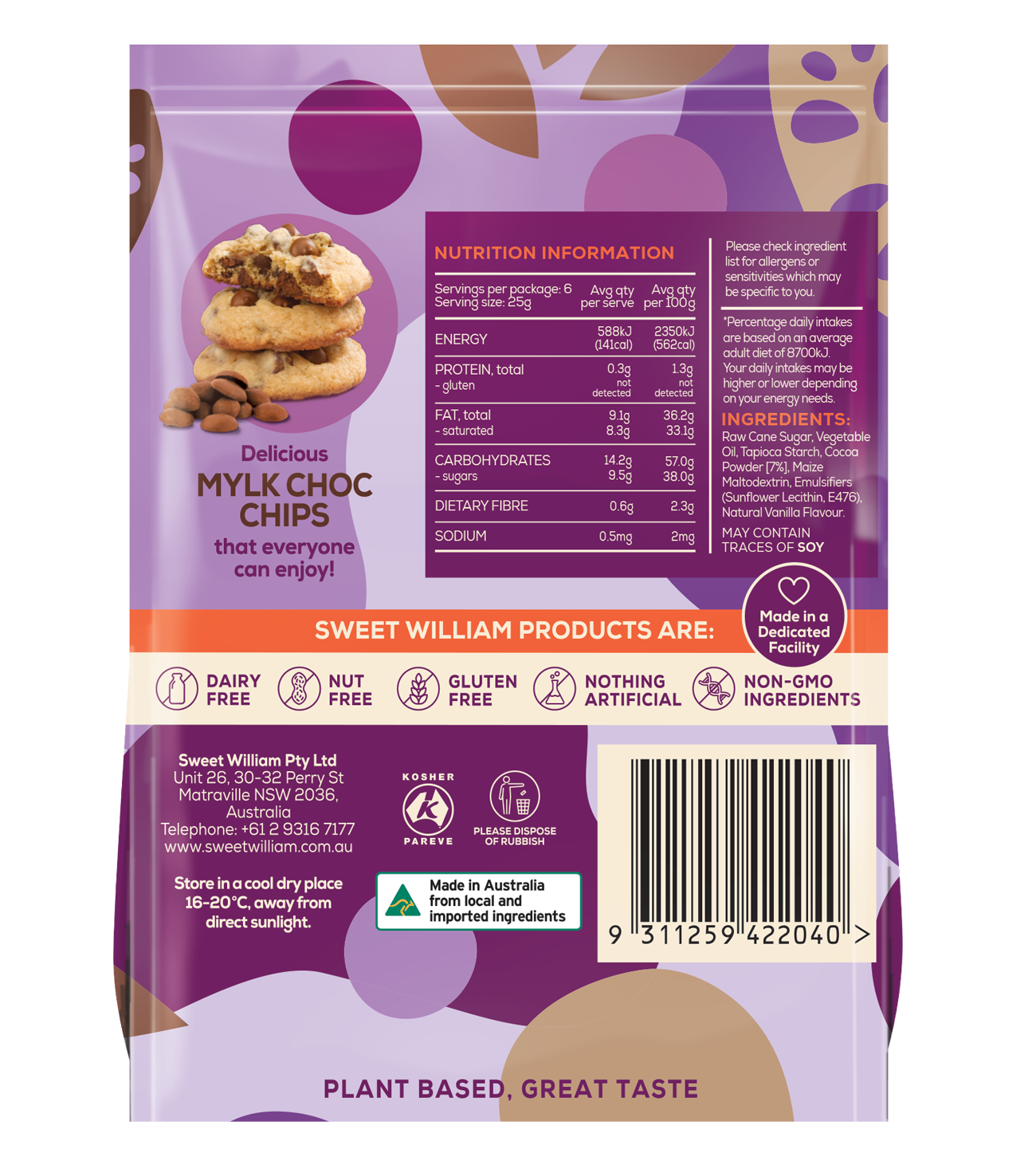 {"id":1119183169,"title":"Sweet William Baking Choc Chips 200g (cold)","handle":"sweet-william-chocolate-chips-150g","description":"\u003cp\u003e\u003cspan\u003eOur tasty little cooking chips are the perfect addition to help you get your bake on – ‘free-from’! Ideal for choc chip cookies and muffins\u003c\/span\u003e.\u003c\/p\u003e\n\u003c!-- TABS --\u003e\n\u003ch5\u003eReviews\u003c\/h5\u003e\n\u003cp\u003eReviews go here\u003c\/p\u003e\n\u003ch5\u003eIngredients\u003c\/h5\u003e\n\u003cp\u003eAny images, tags, filters, product categories, and any other information on this website showing ingredients, nutrition panels, or allergy statements are for guidance only, as manufacturers often change their formulations without notice. Please contact the manufacturer for the most up-to-date ingredient information, or email us to confirm the ingredients of the stock currently on hand.\u003c\/p\u003e\n\u003ch5\u003eImportant Shipping Note\u003c\/h5\u003e\n\u003cdiv\u003e\n\u003cspan\u003eAll orders containing chilled products, frozen products and chocolates must include a Cooler to protect them in transit. The\u003c\/span\u003e\u003cspan\u003e \u003c\/span\u003e\u003cspan\u003eCooler\u003c\/span\u003e\u003cspan\u003e will automatically add to your order when a cold product is added to your shopping cart. \u003c\/span\u003e\u003cspan\u003eFrozen items may defrost in transit, we can not recommend re-freezing. \u003c\/span\u003e\u003cspan\u003eWe will select the correct size cooler for your order. Chilled orders can only be sent to certain areas, please refer to our \u003c\/span\u003e\u003ca data-saferedirecturl=\"https:\/\/www.google.com\/url?q=https:\/\/www.crueltyfreeshop.com.au\/pages\/faq%23refrid\u0026amp;source=gmail\u0026amp;ust=1664430462005000\u0026amp;usg=AOvVaw3YpBIvhTwoxQRA_PVqbP_L\" rel=\"noopener\" href=\"https:\/\/www.crueltyfreeshop.com.au\/pages\/faq#refrid\" target=\"_blank\"\u003eFAQ\u003c\/a\u003e\u003cspan\u003e or email us at \u003c\/span\u003e\u003ca rel=\"noopener\" href=\"mailto:online@vegangrocerystore.com.au\" target=\"_blank\"\u003eonline@vegangrocerystore.\u003cwbr\u003ecom.au\u003c\/wbr\u003e\u003c\/a\u003e\n\u003c\/div\u003e\n\u003cp\u003e\u003c!-- \/TABS --\u003e\u003c\/p\u003e","published_at":"2025-09-15T16:32:56+10:00","created_at":"2015-06-07T23:03:25+10:00","vendor":"Sweet William","type":"Food (GST Free)","tags":["Baking","Chocolate","Sydney Store"],"price":688,"price_min":688,"price_max":688,"available":true,"price_varies":false,"compare_at_price":null,"compare_at_price_min":0,"compare_at_price_max":0,"compare_at_price_varies":false,"variants":[{"id":3446517505,"title":"Default Title","option1":"Default Title","option2":null,"option3":null,"sku":"9311259422040","requires_shipping":true,"taxable":false,"featured_image":null,"available":true,"name":"Sweet William Baking Choc Chips 200g (cold)","public_title":null,"options":["Default Title"],"price":688,"weight":150,"compare_at_price":null,"inventory_quantity":18,"inventory_management":"shopify","inventory_policy":"deny","barcode":"","requires_selling_plan":false,"selling_plan_allocations":[]}],"images":["\/\/www.crueltyfreeshop.com.au\/cdn\/shop\/files\/SWLM1110R.png?v=1764734716","\/\/www.crueltyfreeshop.com.au\/cdn\/shop\/files\/BakingChocChips150gBack.png?v=1764734716","\/\/www.crueltyfreeshop.com.au\/cdn\/shop\/files\/BakingChocChips150g.png?v=1764734716"],"featured_image":"\/\/www.crueltyfreeshop.com.au\/cdn\/shop\/files\/SWLM1110R.png?v=1764734716","options":["Title"],"media":[{"alt":null,"id":43122176491816,"position":1,"preview_image":{"aspect_ratio":1.0,"height":700,"width":700,"src":"\/\/www.crueltyfreeshop.com.au\/cdn\/shop\/files\/SWLM1110R.png?v=1764734716"},"aspect_ratio":1.0,"height":700,"media_type":"image","src":"\/\/www.crueltyfreeshop.com.au\/cdn\/shop\/files\/SWLM1110R.png?v=1764734716","width":700},{"alt":null,"id":37834558767400,"position":2,"preview_image":{"aspect_ratio":0.887,"height":1466,"width":1300,"src":"\/\/www.crueltyfreeshop.com.au\/cdn\/shop\/files\/BakingChocChips150gBack.png?v=1764734716"},"aspect_ratio":0.887,"height":1466,"media_type":"image","src":"\/\/www.crueltyfreeshop.com.au\/cdn\/shop\/files\/BakingChocChips150gBack.png?v=1764734716","width":1300},{"alt":null,"id":37834558800168,"position":3,"preview_image":{"aspect_ratio":0.685,"height":1024,"width":701,"src":"\/\/www.crueltyfreeshop.com.au\/cdn\/shop\/files\/BakingChocChips150g.png?v=1764734716"},"aspect_ratio":0.685,"height":1024,"media_type":"image","src":"\/\/www.crueltyfreeshop.com.au\/cdn\/shop\/files\/BakingChocChips150g.png?v=1764734716","width":701}],"requires_selling_plan":false,"selling_plan_groups":[],"content":"\u003cp\u003e\u003cspan\u003eOur tasty little cooking chips are the perfect addition to help you get your bake on – ‘free-from’! Ideal for choc chip cookies and muffins\u003c\/span\u003e.\u003c\/p\u003e\n\u003c!-- TABS --\u003e\n\u003ch5\u003eReviews\u003c\/h5\u003e\n\u003cp\u003eReviews go here\u003c\/p\u003e\n\u003ch5\u003eIngredients\u003c\/h5\u003e\n\u003cp\u003eAny images, tags, filters, product categories, and any other information on this website showing ingredients, nutrition panels, or allergy statements are for guidance only, as manufacturers often change their formulations without notice. Please contact the manufacturer for the most up-to-date ingredient information, or email us to confirm the ingredients of the stock currently on hand.\u003c\/p\u003e\n\u003ch5\u003eImportant Shipping Note\u003c\/h5\u003e\n\u003cdiv\u003e\n\u003cspan\u003eAll orders containing chilled products, frozen products and chocolates must include a Cooler to protect them in transit. The\u003c\/span\u003e\u003cspan\u003e \u003c\/span\u003e\u003cspan\u003eCooler\u003c\/span\u003e\u003cspan\u003e will automatically add to your order when a cold product is added to your shopping cart. \u003c\/span\u003e\u003cspan\u003eFrozen items may defrost in transit, we can not recommend re-freezing. \u003c\/span\u003e