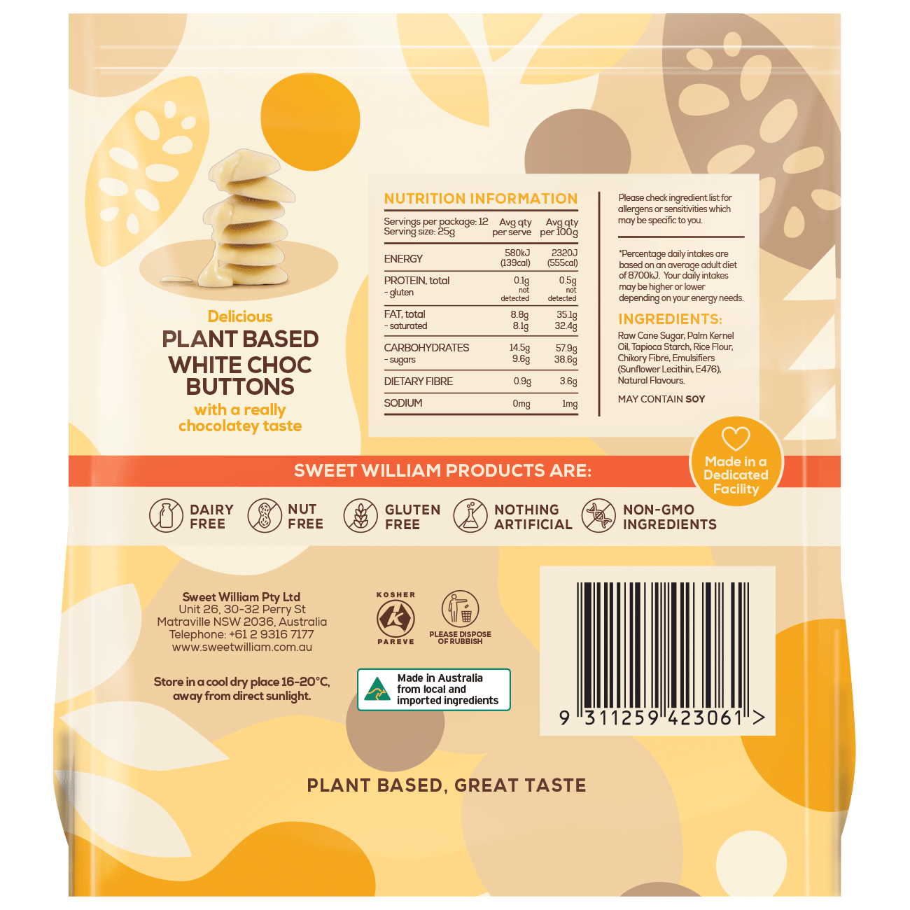 {"id":8463415181,"title":"Sweet William White Baking Buttons 300g (cold)","handle":"sweet-william-white-chocolate-baking-buttons-300g","description":"\u003cp\u003e\u003cspan style=\"color: #333333; font-family: Arial, Helvetica, sans-serif; font-size: 14px; font-weight: bold;\"\u003e\u003c\/span\u003eDream up a sweet new recipe for these babies, they are delish! Sweet William white choc buttons are ideal for melting and can work their way into any recipe.\u003c\/p\u003e\n\u003c!-- TABS --\u003e\n\u003ch5\u003eReviews\u003c\/h5\u003e\n\u003cp\u003eReviews go here\u003c\/p\u003e\n\u003ch5\u003eIngredients\u003c\/h5\u003e\n\u003cp\u003eAny images, tags, filters, product categories, and any other information on this website showing ingredients, nutrition panels, or allergy statements are for guidance only, as manufacturers often change their formulations without notice. Please contact the manufacturer for the most up-to-date ingredient information, or email us to confirm the ingredients of the stock currently on hand.\u003c\/p\u003e\n\u003ch5\u003eImportant Shipping Note\u003c\/h5\u003e\n\u003cdiv\u003e\n\u003cspan\u003eAll orders containing chilled products, frozen products and chocolates must include a Cooler to protect them in transit. The\u003c\/span\u003e\u003cspan\u003e \u003c\/span\u003e\u003cspan\u003eCooler\u003c\/span\u003e\u003cspan\u003e will automatically add to your order when a cold product is added to your shopping cart. \u003c\/span\u003e\u003cspan\u003eFrozen items may defrost in transit, we can not recommend re-freezing. \u003c\/span\u003e\u003cspan\u003eWe will select the correct size cooler for your order. Chilled orders can only be sent to certain areas, please refer to our \u003c\/span\u003e\u003ca href=\"https:\/\/www.crueltyfreeshop.com.au\/pages\/faq#refrid\" rel=\"noopener\" data-saferedirecturl=\"https:\/\/www.google.com\/url?q=https:\/\/www.crueltyfreeshop.com.au\/pages\/faq%23refrid\u0026amp;source=gmail\u0026amp;ust=1664430462005000\u0026amp;usg=AOvVaw3YpBIvhTwoxQRA_PVqbP_L\" target=\"_blank\"\u003eFAQ\u003c\/a\u003e\u003cspan\u003e or email us at \u003c\/span\u003e\u003ca href=\"mailto:online@vegangrocerystore.com.au\" rel=\"noopener\" target=\"_blank\"\u003eonline@vegangrocerystore.\u003cwbr\u003ecom.au\u003c\/wbr\u003e\u003c\/a\u003e\n\u003c\/div\u003e\n\u003c!-- \/TABS --\u003e","published_at":"2025-11-19T11:21:12+11:00","created_at":"2016-11-20T13:46:25+11:00","vendor":"Sweet William","type":"Food (GST Free)","tags":["Baking","Chocolate","Sydney Store"],"price":850,"price_min":850,"price_max":850,"available":true,"price_varies":false,"compare_at_price":null,"compare_at_price_min":0,"compare_at_price_max":0,"compare_at_price_varies":false,"variants":[{"id":28595330765,"title":"Default Title","option1":"Default Title","option2":null,"option3":null,"sku":"9311259423061","requires_shipping":true,"taxable":false,"featured_image":null,"available":true,"name":"Sweet William White Baking Buttons 300g (cold)","public_title":null,"options":["Default Title"],"price":850,"weight":300,"compare_at_price":null,"inventory_quantity":5,"inventory_management":"shopify","inventory_policy":"deny","barcode":"","requires_selling_plan":false,"selling_plan_allocations":[]}],"images":["\/\/www.crueltyfreeshop.com.au\/cdn\/shop\/files\/SWLM1130R.jpg?v=1764736008","\/\/www.crueltyfreeshop.com.au\/cdn\/shop\/files\/WhiteBakingButtons300gBack.png?v=1764736008","\/\/www.crueltyfreeshop.com.au\/cdn\/shop\/products\/product-graphics11.png?v=1764736008"],"featured_image":"\/\/www.crueltyfreeshop.com.au\/cdn\/shop\/files\/SWLM1130R.jpg?v=1764736008","options":["Title"],"media":[{"alt":null,"id":43122387091752,"position":1,"preview_image":{"aspect_ratio":1.0,"height":700,"width":700,"src":"\/\/www.crueltyfreeshop.com.au\/cdn\/shop\/files\/SWLM1130R.jpg?v=1764736008"},"aspect_ratio":1.0,"height":700,"media_type":"image","src":"\/\/www.crueltyfreeshop.com.au\/cdn\/shop\/files\/SWLM1130R.jpg?v=1764736008","width":700},{"alt":null,"id":37835021156648,"position":2,"preview_image":{"aspect_ratio":1.0,"height":1300,"width":1300,"src":"\/\/www.crueltyfreeshop.com.au\/cdn\/shop\/files\/WhiteBakingButtons300gBack.png?v=1764736008"},"aspect_ratio":1.0,"height":1300,"media_type":"image","src":"\/\/www.crueltyfreeshop.com.au\/cdn\/shop\/files\/WhiteBakingButtons300gBack.png?v=1764736008","width":1300},{"alt":null,"id":22227367592093,"position":3,"preview_image":{"aspect_ratio":0.685,"height":1012,"width":693,"src":"\/\/www.crueltyfreeshop.com.au\/cdn\/shop\/products\/product-graphics11.png?v=1764736008"},"aspect_ratio":0.685,"height":1012,"media_type":"image","src":"\/\/www.crueltyfreeshop.com.au\/cdn\/shop\/products\/product-graphics11.png?v=1764736008","width":693}],"requires_selling_plan":false,"selling_plan_groups":[],"content":"\u003cp\u003e\u003cspan style=\"color: #333333; font-family: Arial, Helvetica, sans-serif; font-size: 14px; font-weight: bold;\"\u003e\u003c\/span\u003eDream up a sweet new recipe for these babies, they are delish! Sweet William white choc buttons are ideal for melting and can work their way into any recipe.\u003c\/p\u003e\n\u003c!-- TABS --\u003e\n\u003ch5\u003eReviews\u003c\/h5\u003e\n\u003cp\u003eReviews go here\u003c\/p\u003e\n\u003ch5\u003eIngredients\u003c\/h5\u003e\n\u003cp\u003eAny images, tags, filters, product categories, and any other information on this website showing ingredients, nutrition panels, or allergy statements are for guidance only, as manufacturers often change their formulations without notice. Please contact the manufacturer for the most up-to-date ingredient information, or email us to confirm the ingredients of the stock currently on hand.\u003c\/p\u003e\n\u003ch5\u003eImportant Shipping Note\u003c\/h5\u003e\n\u003cdiv\u003e\n\u003cspan\u003eAll orders containing chilled products, frozen products and chocolates must include a Cooler to protect them in transit. The\u003c\/span\u003e\u003cspan\u003e \u003c\/span\u003e\u003cspan\u003eCooler\u003c\/spa