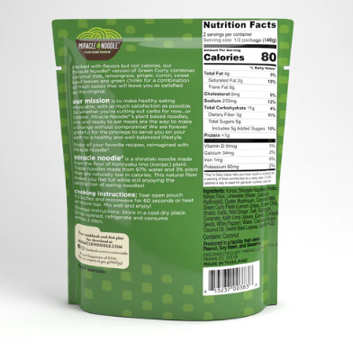 280g. Ingredients: Konjac Shirataki Noodles (Water, Konjac Flour, Limewater (Calcium Hydroxide)), Oyster Mushroom, Coconut Milk, Green Curry Paste (Lemon Grass, Green Chilli, Shallot, Garlic, Wild Ginger, Salt, Galangal, Coriander, Kaffir Lime Leaves, Cumin, Coriander Seeds, White Pepper), Water, Coconut Sugar, Coconut Oil, Sweet Basil Leaves, Lactic Acid