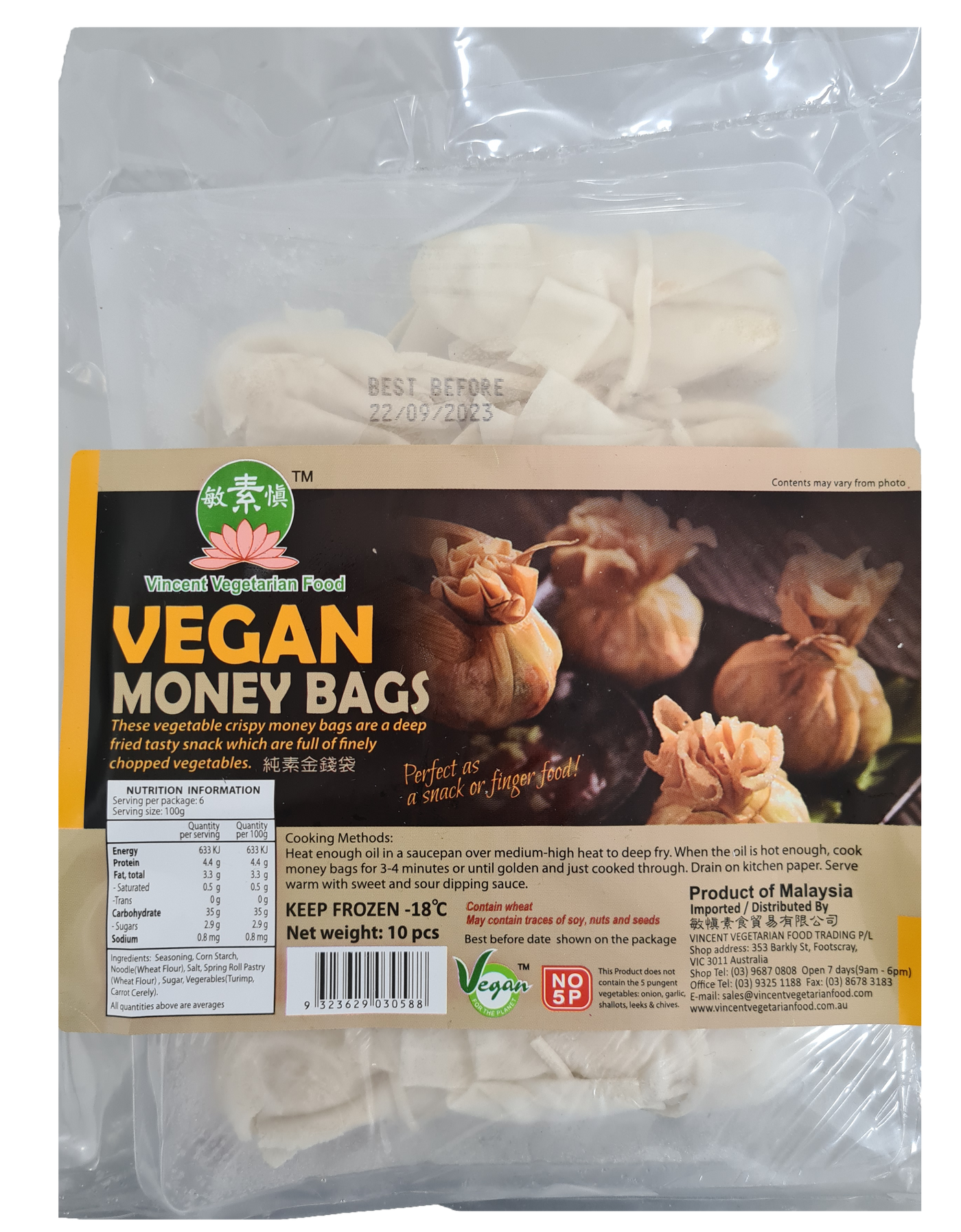{"id":9431543316776,"title":"Vincent Money Bags 10pc (cold)","handle":"tbdvincent-vegetarian-money-bags-10pk-cold-case-6","description":"\u003cp\u003eVincent Vegetarian Food Trading has been operating since 1996, retailing and wholesaling oriental vegetarian and vegan food. Their aim is to encourage people to eat healthy, live longer, enjoy a peaceful and harmonious lifestyle; and to provide customers the best quality and a great variety of vegetarian and vegan foods for the Australian market.\u003c\/p\u003e\n\u003c!-- TABS --\u003e\n\u003ch5\u003eReviews\u003c\/h5\u003e\n\u003cp\u003eReviews go here\u003c\/p\u003e\n\u003ch5\u003eIngredients\u003c\/h5\u003e\n\u003cp\u003eAny images, tags, filters, product categories, and any other information on this website showing ingredients, nutrition panels, or allergy statements are for guidance only, as manufacturers often change their formulations without notice. Please contact the manufacturer for the most up-to-date ingredient information, or email us to confirm the ingredients of the stock currently on hand.\u003c\/p\u003e\n\u003ch5\u003eImportant Shipping Note\u003c\/h5\u003e\n\u003cdiv\u003e\n\u003cspan\u003eAll orders containing chilled products, frozen products and chocolates must include a Cooler to protect them in transit. The\u003c\/span\u003e\u003cspan\u003e \u003c\/span\u003e\u003cspan\u003eCooler\u003c\/span\u003e\u003cspan\u003e will automatically add to your order when a cold product is added to your shopping cart. \u003c\/span\u003e\u003cspan\u003eFrozen items may defrost in transit, we can not recommend re-freezing. \u003c\/span\u003e\u003cspan\u003eWe will select the correct size cooler for your order. Chilled orders can only be sent to certain areas, please refer to our \u003c\/span\u003e\u003ca href=\"https:\/\/www.crueltyfreeshop.com.au\/pages\/faq#refrid\" rel=\"noopener\" target=\"_blank\" data-saferedirecturl=\"https:\/\/www.google.com\/url?q=https:\/\/www.crueltyfreeshop.com.au\/pages\/faq%23refrid\u0026amp;source=gmail\u0026amp;ust=1664430462005000\u0026amp;usg=AOvVaw3YpBIvhTwoxQRA_PVqbP_L\"\u003eFAQ\u003c\/a\u003e\u003cspan\u003e or email us at \u003c\/span\u003e\u003ca href=\"mailto:online@vegangrocerystore.com.au\" rel=\"noopener\" target=\"_blank\"\u003eonline@vegangrocerystore.\u003cwbr\u003ecom.au\u003c\/wbr\u003e\u003c\/a\u003e\n\u003c\/div\u003e\n\u003c!-- \/TABS --\u003e","published_at":"2025-11-19T11:21:00+11:00","created_at":"2024-09-09T13:47:35+10:00","vendor":"Vincent Vegetarian","type":"Refrig food (GST Free)","tags":["Appetisers","Sydney Store"],"price":686,"price_min":686,"price_max":686,"available":true,"price_varies":false,"compare_at_price":null,"compare_at_price_min":0,"compare_at_price_max":0,"compare_at_price_varies":false,"variants":[{"id":49202422776104,"title":"Default Title","option1":"Default Title","option2":null,"option3":null,"sku":"9323629030588","requires_shipping":true,"taxable":false,"featured_image":null,"available":true,"name":"Vincent Money Bags 10pc (cold)","public_title":null,"options":["Default Title"],"price":686,"weight":0,"compare_at_price":null,"inventory_quantity":6,"inventory_management":"shopify","inventory_policy":"deny","barcode":null,"requires_selling_plan":false,"selling_plan_allocations":[]}],"images":["\/\/www.crueltyfreeshop.com.au\/cdn\/shop\/files\/MoneyBags.png?v=1763704720","\/\/www.crueltyfreeshop.com.au\/cdn\/shop\/files\/vincentmoneybags-NutritionalInfo.jpg?v=1763704720"],"featured_image":"\/\/www.crueltyfreeshop.com.au\/cdn\/shop\/files\/MoneyBags.png?v=1763704720","options":["Title"],"media":[{"alt":null,"id":43022308475176,"position":1,"preview_image":{"aspect_ratio":0.78,"height":3538,"width":2760,"src":"\/\/www.crueltyfreeshop.com.au\/cdn\/shop\/files\/MoneyBags.png?v=1763704720"},"aspect_ratio":0.78,"height":3538,"media_type":"image","src":"\/\/www.crueltyfreeshop.com.au\/cdn\/shop\/files\/MoneyBags.png?v=1763704720","width":2760},{"alt":null,"id":43014515228968,"position":2,"preview_image":{"aspect_ratio":1.0,"height":400,"width":400,"src":"\/\/www.crueltyfreeshop.com.au\/cdn\/shop\/files\/vincentmoneybags-NutritionalInfo.jpg?v=1763704720"},"aspect_ratio":1.0,"height":400,"media_type":"image","src":"\/\/www.crueltyfreeshop.com.au\/cdn\/shop\/files\/vincentmoneybags-NutritionalInfo.jpg?v=1763704720","width":400}],"requires_selling_plan":false,"selling_plan_groups":[],"content":"\u003cp\u003eVincent Vegetarian Food Trading has been operating since 1996, retailing and wholesaling oriental vegetarian and vegan food. Their aim is to encourage people to eat healthy, live longer, enjoy a peaceful and harmonious lifestyle; and to provide customers the best quality and a great variety of vegetarian and vegan foods for the Australian market.\u003c\/p\u003e\n\u003c!-- TABS --\u003e\n\u003ch5\u003eReviews\u003c\/h5\u003e\n\u003cp\u003eReviews go here\u003c\/p\u003e\n\u003ch5\u003eIngredients\u003c\/h5\u003e\n\u003cp\u003eAny images, tags, filters, product categories, and any other information on this website showing ingredients, nutrition panels, or allergy statements are for guidance only, as manufacturers often change their formulations without notice. Please contact the manufacturer for the most up-to-date ingredient information, or email us to confirm the ingredients of the stock currently on hand.\u003c\/p\u003e\n\u003ch5\u003eImportant Shipping Note\u003c\/h5\u003e\n\u003cdiv\u003e\n\u003cspan\u003eAll orders containing chilled products, frozen products and chocolates must include a Cooler to protect them in transit. The\u003c\/span\u003e\u003cspan\u003e \u003c\/span\u003e\u003cspan\u003eCooler\u003c\/span\u003e\u003cspan\u003e will automatically add to your order when a cold product is added to your shopping cart. \u003c\/span\u003e\u003cspan\u003eFrozen items may defrost in transit, we can not recommend re-freezing. \u003c\/span\u003e\u003cspan\u003eWe will select the correct size cooler for your order. Chilled orders can only be sent to certain areas, pleas