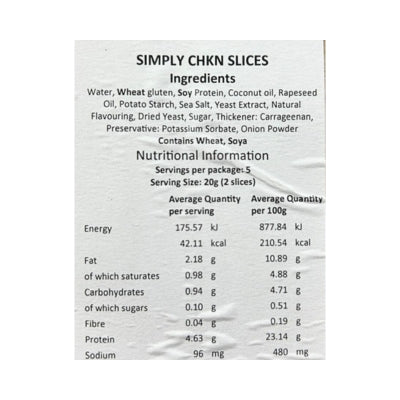 {"id":6698349428893,"title":"VBites Chicken Slices 100g (cold)","handle":"vbiteschickenslices100g","description":"\u003cp\u003eThese chicken-style slices make any sandwich better! They are high in protein, cholesterol and palm oil free with no artificial colours or preservatives.\u003c\/p\u003e\n\u003c!-- TABS --\u003e\n\u003ch5\u003eReviews\u003c\/h5\u003e\n\u003cp\u003eReviews go here\u003c\/p\u003e\n\u003ch5\u003eIngredients\u003c\/h5\u003e\n\u003cp\u003eAny images, tags, filters, product categories, and any other information on this website showing ingredients, nutrition panels, or allergy statements are for guidance only, as manufacturers often change their formulations without notice. Please contact the manufacturer for the most up-to-date ingredient information, or email us to confirm the ingredients of the stock currently on hand.\u003c\/p\u003e\n\u003ch5\u003eImportant Shipping Note\u003c\/h5\u003e\n\u003cdiv\u003e\n\u003cspan\u003eAll orders containing chilled products, frozen products and chocolates must include a Cooler to protect them in transit. The\u003c\/span\u003e\u003cspan\u003e \u003c\/span\u003e\u003cspan\u003eCooler\u003c\/span\u003e\u003cspan\u003e will automatically add to your order when a cold product is added to your shopping cart. \u003c\/span\u003e\u003cspan\u003eFrozen items may defrost in transit, we can not recommend re-freezing. \u003c\/span\u003e\u003cspan\u003eWe will select the correct size cooler for your order. Chilled orders can only be sent to certain areas, please refer to our \u003c\/span\u003e\u003ca href=\"https:\/\/www.crueltyfreeshop.com.au\/pages\/faq#refrid\" rel=\"noopener\" target=\"_blank\" data-saferedirecturl=\"https:\/\/www.google.com\/url?q=https:\/\/www.crueltyfreeshop.com.au\/pages\/faq%23refrid\u0026amp;source=gmail\u0026amp;ust=1664430462005000\u0026amp;usg=AOvVaw3YpBIvhTwoxQRA_PVqbP_L\"\u003eFAQ\u003c\/a\u003e\u003cspan\u003e or email us at \u003c\/span\u003e\u003ca href=\"mailto:online@vegangrocerystore.com.au\" rel=\"noopener\" target=\"_blank\"\u003eonline@vegangrocerystore.\u003cwbr\u003ecom.au\u003c\/wbr\u003e\u003c\/a\u003e\n\u003c\/div\u003e\n\u003c!-- \/TABS --\u003e","published_at":"2024-09-06T14:03:51+10:00","created_at":"2021-05-07T16:20:46+10:00","vendor":"VBites","type":"Refrig food (GST Free)","tags":["Chicken","Deli","Sydney Store"],"price":610,"price_min":610,"price_max":610,"available":true,"price_varies":false,"compare_at_price":null,"compare_at_price_min":0,"compare_at_price_max":0,"compare_at_price_varies":false,"variants":[{"id":39865504792733,"title":"Default Title","option1":"Default Title","option2":null,"option3":null,"sku":"5021821144471","requires_shipping":true,"taxable":false,"featured_image":null,"available":true,"name":"VBites Chicken Slices 100g (cold)","public_title":null,"options":["Default Title"],"price":610,"weight":100,"compare_at_price":null,"inventory_quantity":5,"inventory_management":"shopify","inventory_policy":"deny","barcode":"","requires_selling_plan":false,"selling_plan_allocations":[]}],"images":["\/\/www.crueltyfreeshop.com.au\/cdn\/shop\/files\/CHTN1020R.jpg?v=1763783799","\/\/www.crueltyfreeshop.com.au\/cdn\/shop\/files\/vbiteschickenslices-NutritionalInfo.jpg?v=1763783799"],"featured_image":"\/\/www.crueltyfreeshop.com.au\/cdn\/shop\/files\/CHTN1020R.jpg?v=1763783799","options":["Title"],"media":[{"alt":null,"id":43028247970088,"position":1,"preview_image":{"aspect_ratio":1.0,"height":700,"width":700,"src":"\/\/www.crueltyfreeshop.com.au\/cdn\/shop\/files\/CHTN1020R.jpg?v=1763783799"},"aspect_ratio":1.0,"height":700,"media_type":"image","src":"\/\/www.crueltyfreeshop.com.au\/cdn\/shop\/files\/CHTN1020R.jpg?v=1763783799","width":700},{"alt":null,"id":43021654360360,"position":2,"preview_image":{"aspect_ratio":1.0,"height":400,"width":400,"src":"\/\/www.crueltyfreeshop.com.au\/cdn\/shop\/files\/vbiteschickenslices-NutritionalInfo.jpg?v=1763783799"},"aspect_ratio":1.0,"height":400,"media_type":"image","src":"\/\/www.crueltyfreeshop.com.au\/cdn\/shop\/files\/vbiteschickenslices-NutritionalInfo.jpg?v=1763783799","width":400}],"requires_selling_plan":false,"selling_plan_groups":[],"content":"\u003cp\u003eThese chicken-style slices make any sandwich better! They are high in protein, cholesterol and palm oil free with no artificial colours or preservatives.\u003c\/p\u003e\n\u003c!-- TABS --\u003e\n\u003ch5\u003eReviews\u003c\/h5\u003e\n\u003cp\u003eReviews go here\u003c\/p\u003e\n\u003ch5\u003eIngredients\u003c\/h5\u003e\n\u003cp\u003eAny images, tags, filters, product categories, and any other information on this website showing ingredients, nutrition panels, or allergy statements are for guidance only, as manufacturers often change their formulations without notice. Please contact the manufacturer for the most up-to-date ingredient information, or email us to confirm the ingredients of the stock currently on hand.\u003c\/p\u003e\n\u003ch5\u003eImportant Shipping Note\u003c\/h5\u003e\n\u003cdiv\u003e\n\u003cspan\u003eAll orders containing chilled products, frozen products and chocolates must include a Cooler to protect them in transit. The\u003c\/span\u003e\u003cspan\u003e \u003c\/span\u003e\u003cspan\u003eCooler\u003c\/span\u003e\u003cspan\u003e will automatically add to your order when a cold product is added to your shopping cart. \u003c\/span\u003e\u003cspan\u003eFrozen items may defrost in transit, we can not recommend re-freezing. \u003c\/span\u003e\u003cspan\u003eWe will select the correct size cooler for your order. Chilled orders can only be sent to certain areas, please refer to our \u003c\/span\u003e\u003ca href=\"https:\/\/www.crueltyfreeshop.com.au\/pages\/faq#refrid\" rel=\"noopener\" target=\"_blank\" data-saferedirecturl=\"https:\/\/www.google.com\/url?q=https:\/\/www.crueltyfreeshop.com.au\/pages\/faq%23refrid\u0026amp;source=gmail\u0026amp;ust=1664430462005000\u0026amp;usg=AOvVaw3YpBIvhTwoxQRA_PVqbP_L\"\u003eFAQ\u003c\/a\u003e\u003cspan\u003e or email us at \u003c\/sp